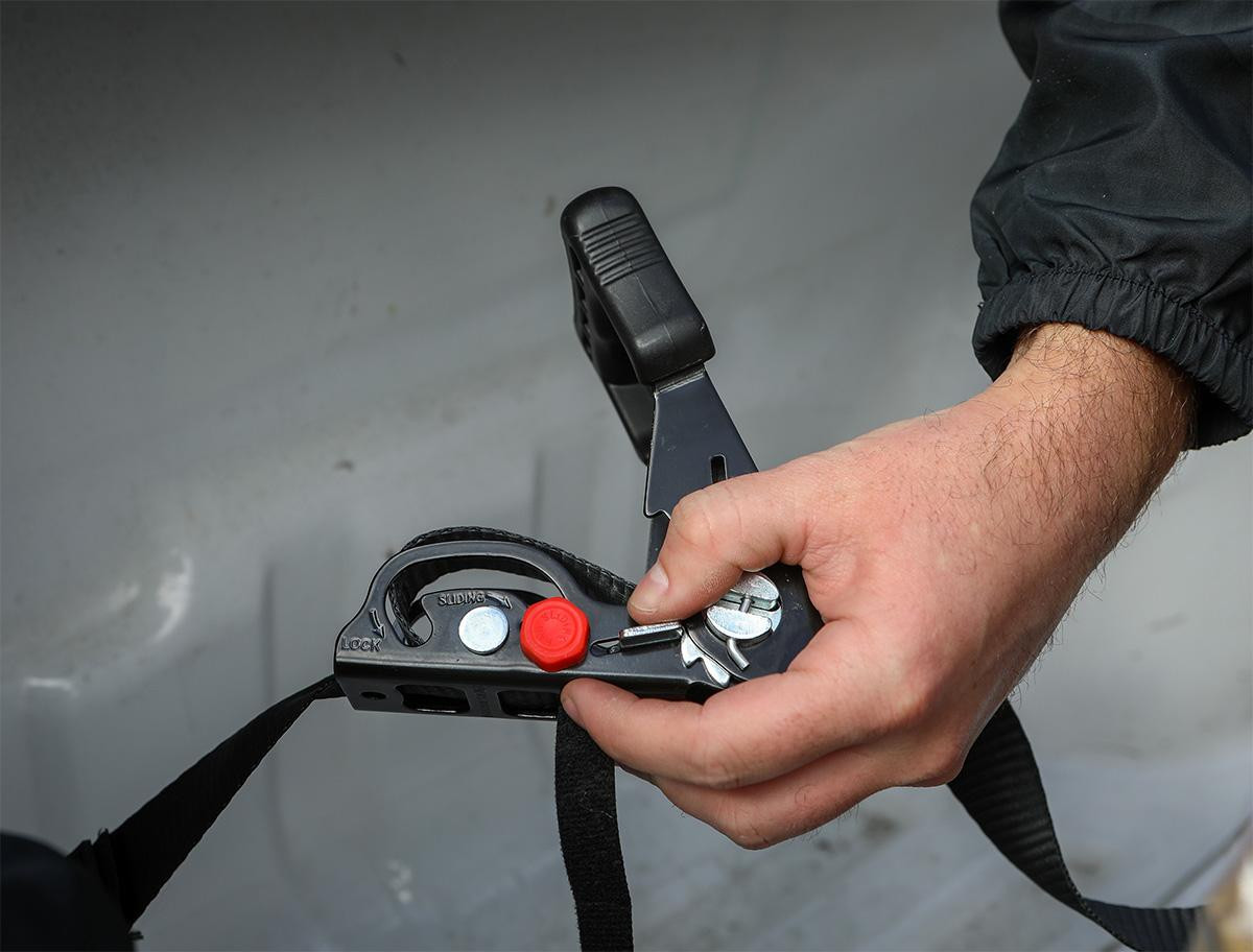 The Bullring Sliding Ratchet solves this issue because the ratchet can be moved by sliding it higher up the strap where it's easier to access. Simply release the red locking bolt on the ratchet, slide it up along the strap to where it's comfortably accessible, and lock down the red bolt. You can then ratchet down the strap tight without it getting caught up in the side of your bed.
