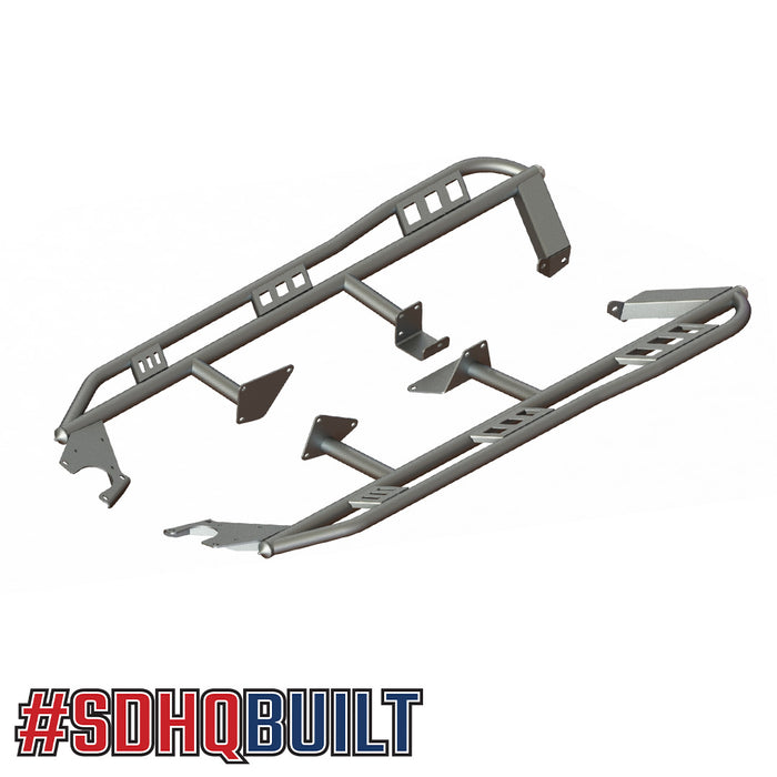 These rock sliders are CAD designed and built in-house for a precise fit and finish. Our rock sliders use a unique mounting design that is intended to be a bolt-on design that reaches the entirety of the slider, so there is no cutting, welding, or drilling required for installation and there are no permanent frame modifications required. All mounting hardware is included with the purchase of your SDHQ Built Sliders