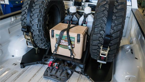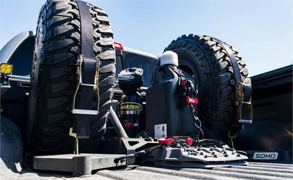 This modularly designed rack can safely fit two 37 inch tires and provides storage underneath for Maxtrax or Tred Pro recovery ramps. Using factory hardware it bolts directly to the bed, no cutting or drilling is required.
