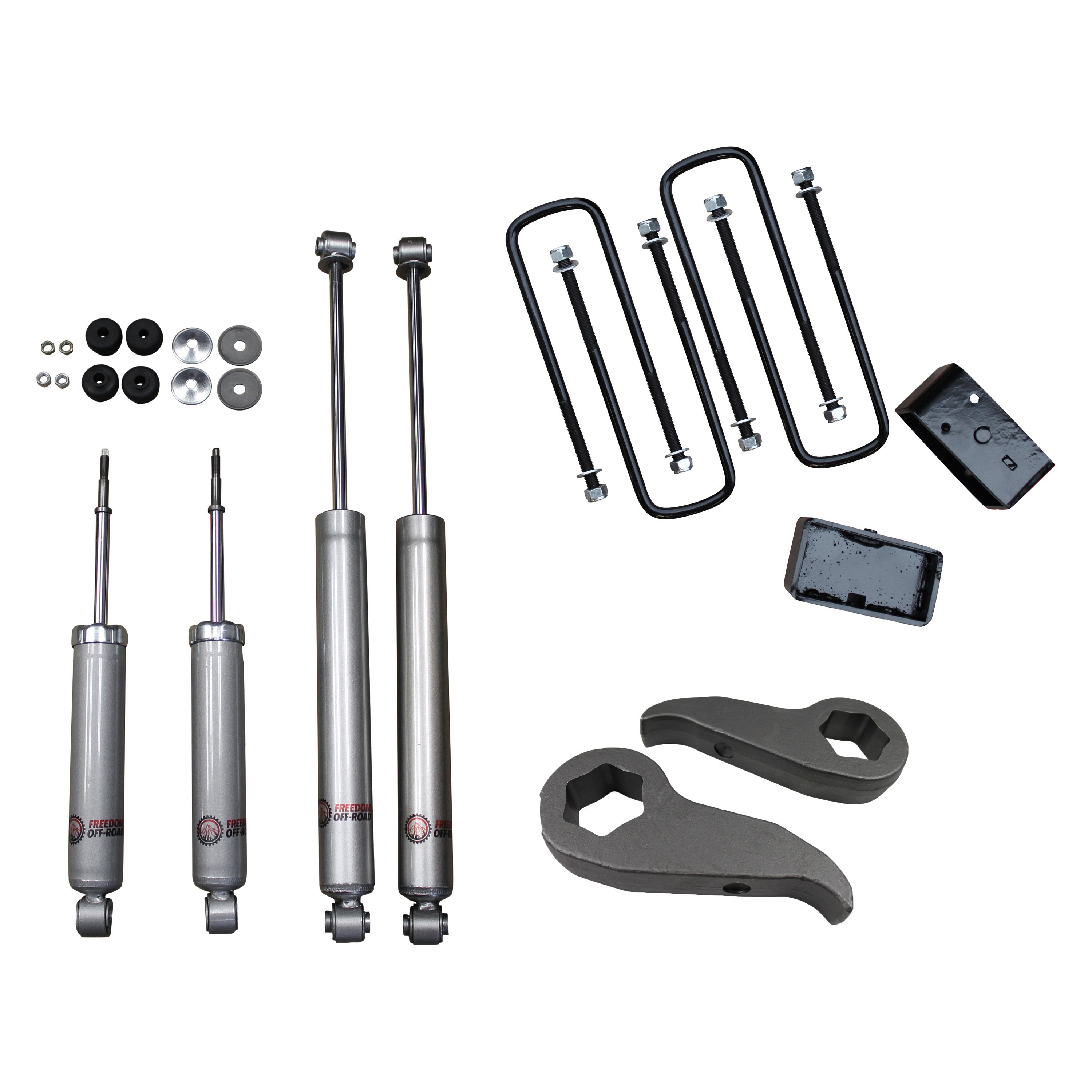 - Adjustable For 1-3 Inch Of Front Lift (Fo-G104F) Carbon Steel 3 Inch Rear Lift Blocks With Extended U-Bolts (Fo-G30420+Fo-G408) High Pressure Nitrogen Charged Shocks (Fo-G304)