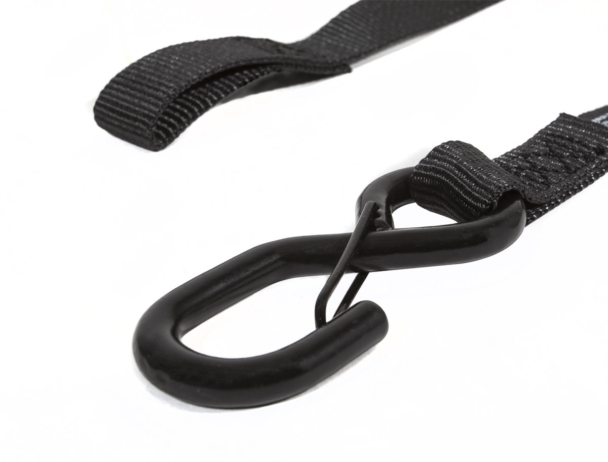The ratchets are made from steel, anodized black, and feature a hand-molded grip for comfort. Both ends feature heavy-duty 9.5mm coated (S) hooks with a retention clip that keeps the hook secured until you can get the strap tightened down.