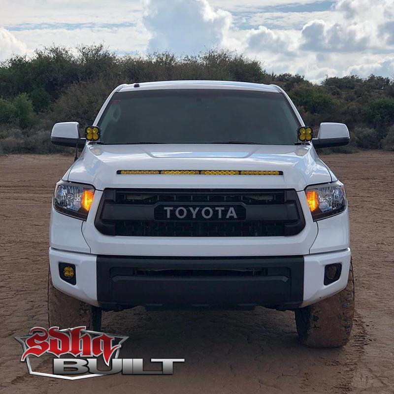 Our SDHQ Built Hood Scoop LED Light Bar Mount for the 2014-2021 Toyota Tundra allows you to securely mount a Baja Designs 40 inch S8 LED light bar in your Tundra's factory hood scoop (upper grille).