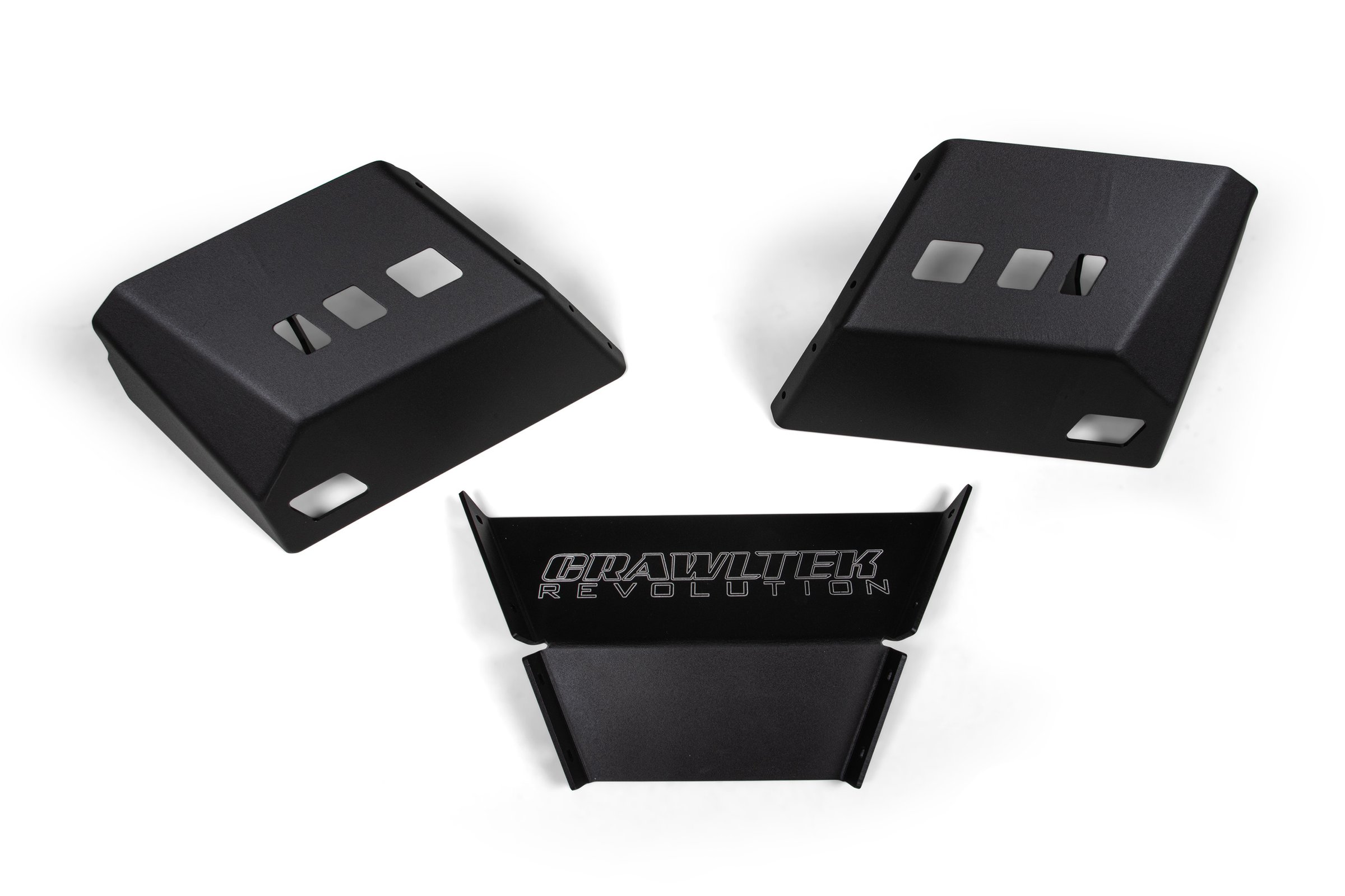 Specially formed for a precision fit, fully welded, and finished in a durable semi-gloss black powder coat, this skid plate is a massive upgrade over the factory plastic skid in both appearance and protection. The center aluminum plate is laser engraved with the Crawltek Revolution logo, boldly branding the front of your Jeep.