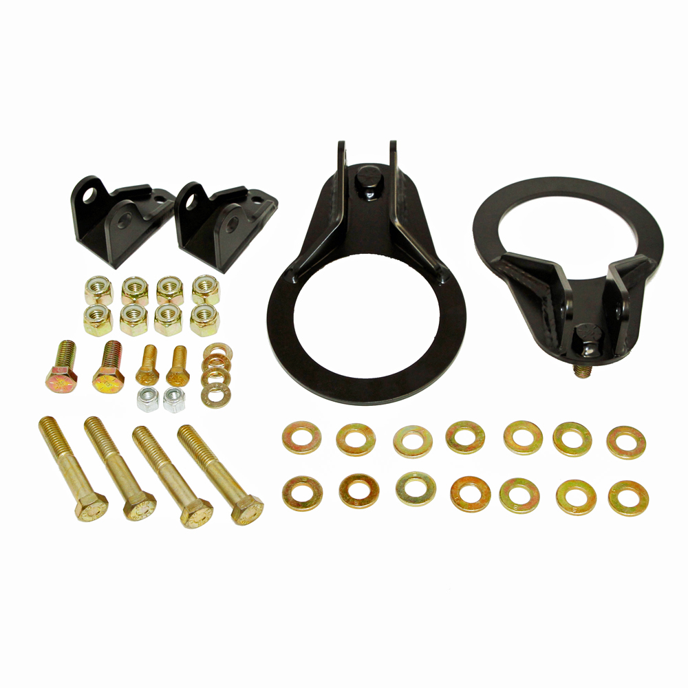 Installation is simple and doesn't require any welding or fabrication, only 2 3/8 inch holes need to be drilled in the lower factory shock bracket for installation. The upper bracket installs in the factory location without any cutting or drilling, simply remove the factory shock and install the new bracket in the holes provided when the stock shock is removed.