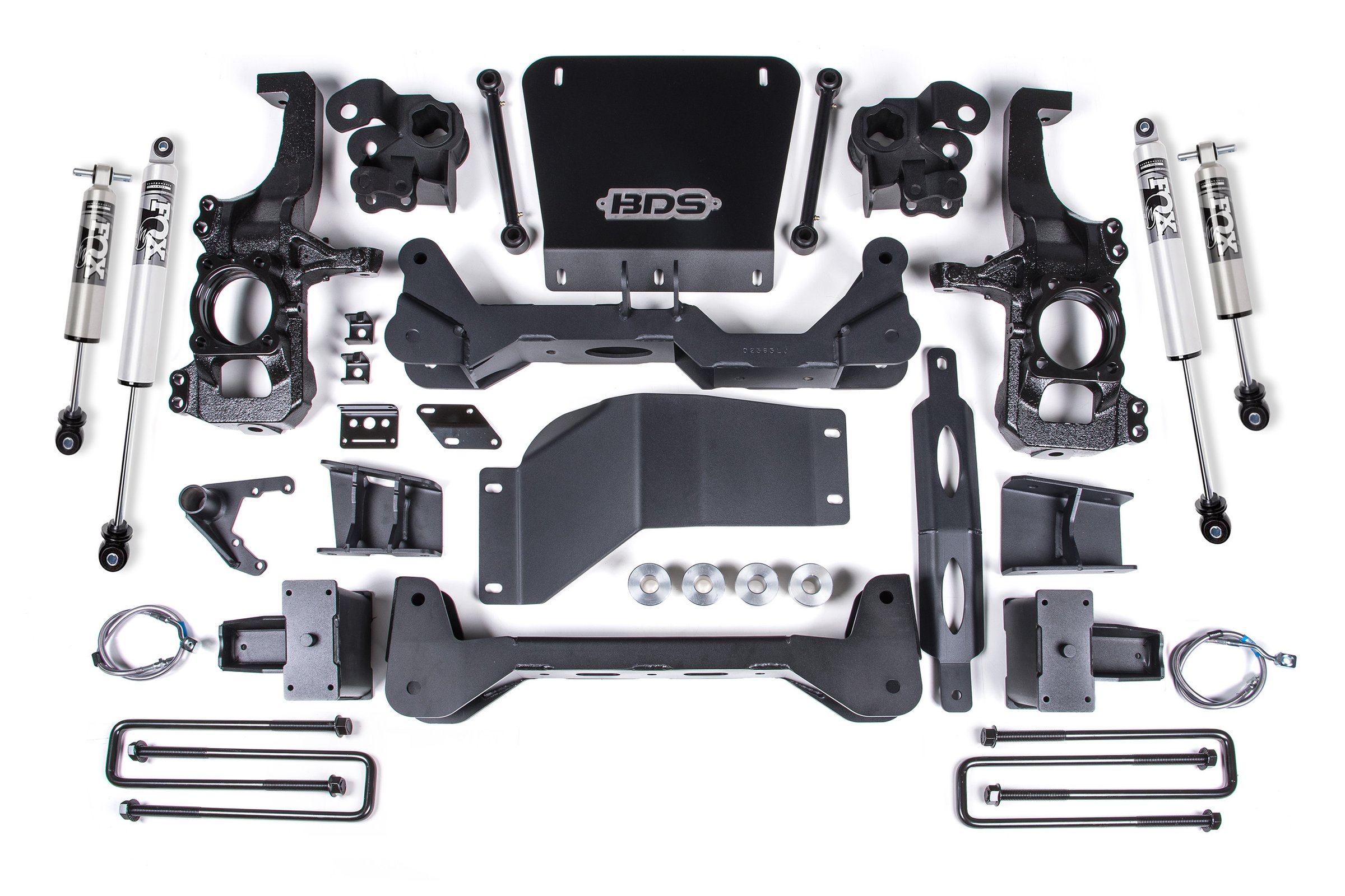In the rear BDS offers replacement lift blocks and u-bolts to lift and level that stance. The lift block installs in place of the stock block and retains ride quality and load capacity. Also included, BDS supplies brake line and ABS line relocation brackets allow the use of factory brake lines. Lastly are a matching set of NX2 Nitro or FOX 2.0 Performance Series shocks.