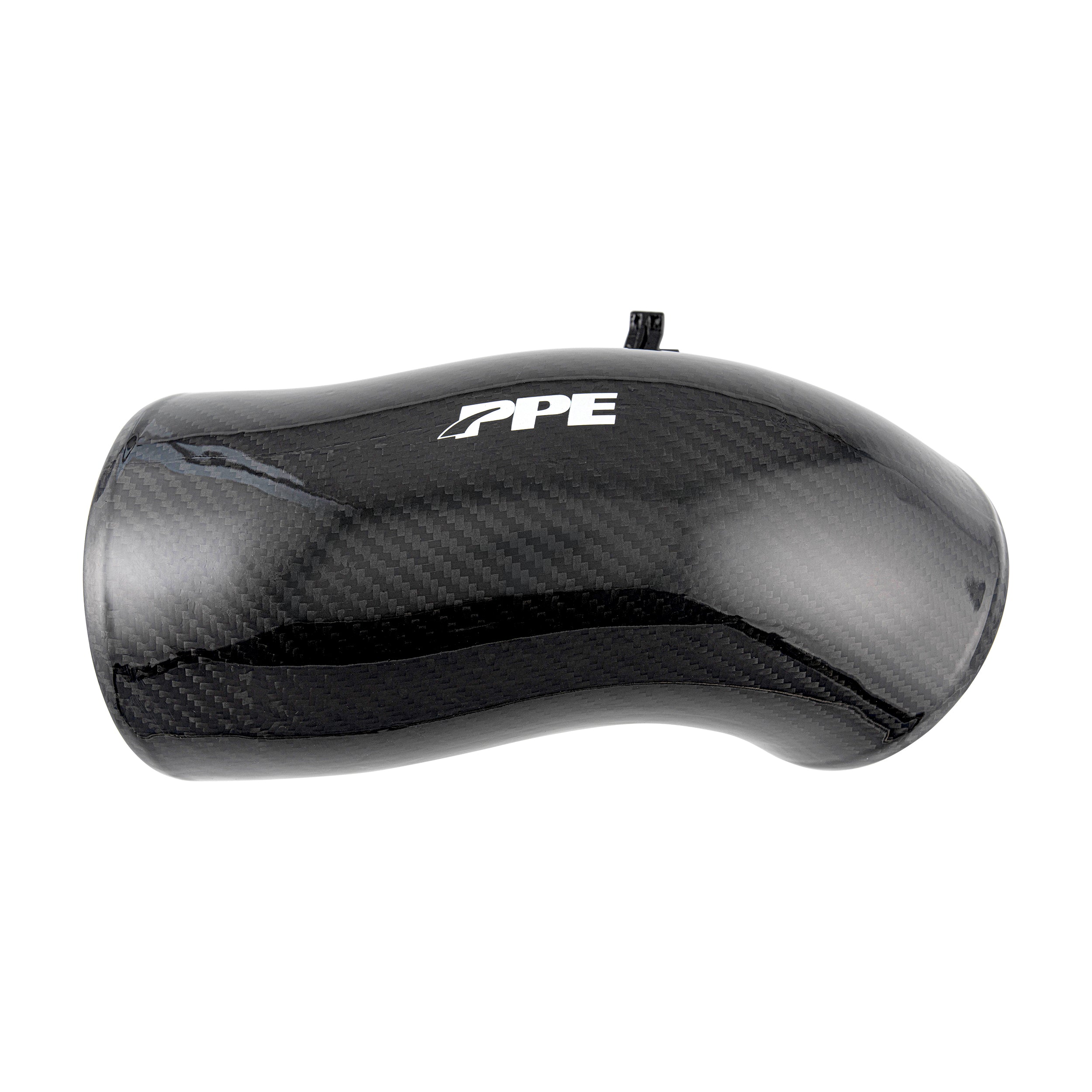 On the turbo inlet side, the system features a four-inch stainless steel turbo inlet, paired with a dry-carbon-fiber airbox duct. Unlike the stock components, which transition from circular shape to oval shape and then back to circular shape, both PPE components maintain a fully round design.