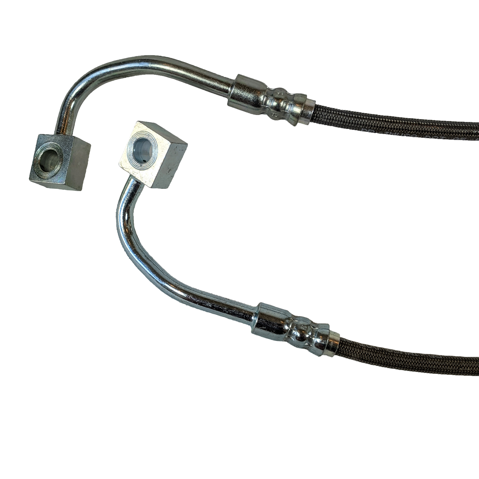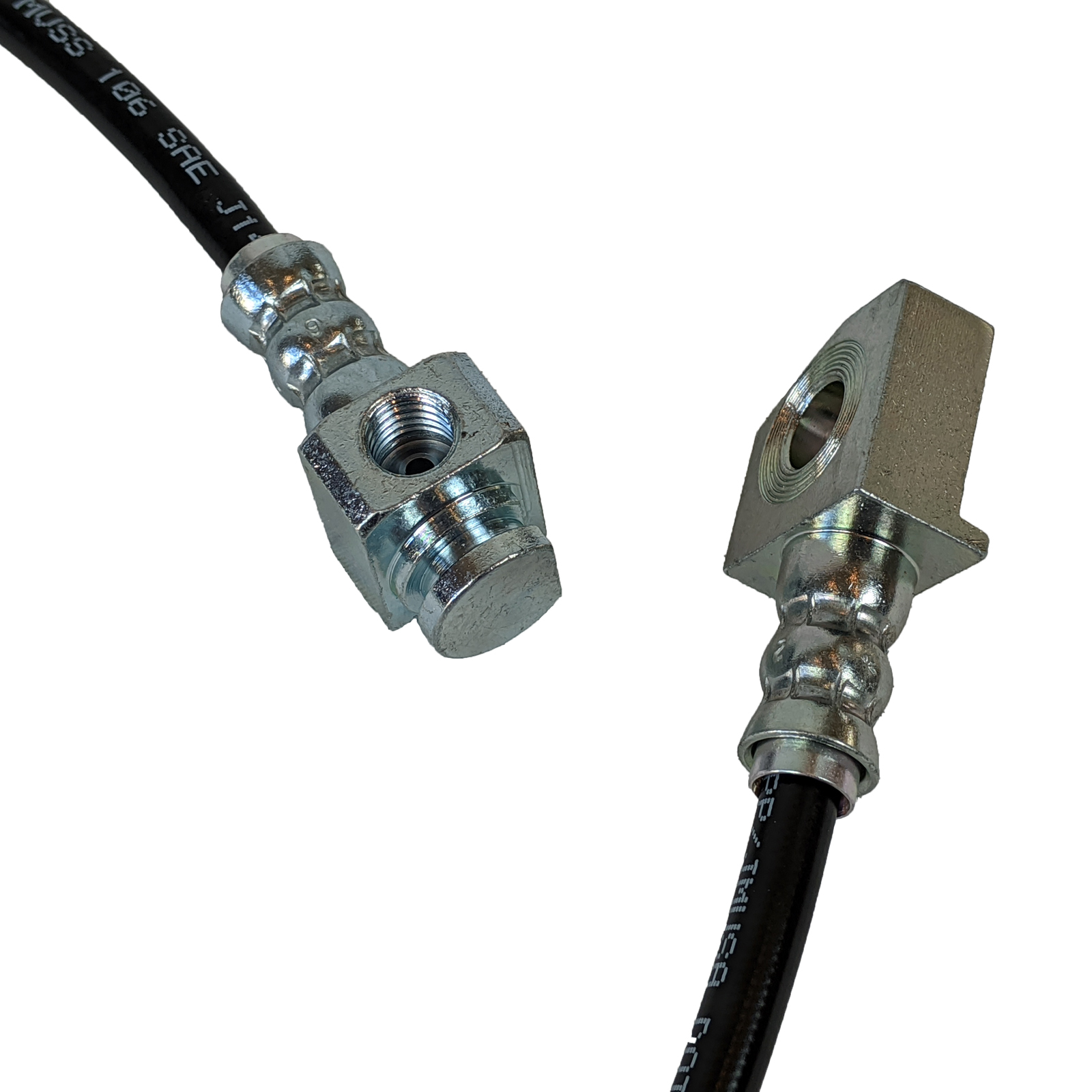 J and M Products direct fit D.O.T. certified PTFE lined brake hoses. These brake hose assemblies use true OEM style direct replacement non-universal fittings to achieve proper factory hose routing and fitment. Expansion of stock rubber hoses causes a spongy brake pedal feel and loss of initial braking force.
