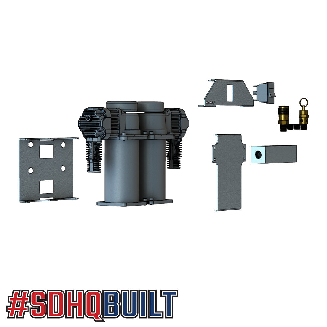 • Uses SDHQ Bronco Engine Bay Air Compressor Mount to mount Viair Kit. Customer needs to purchase the engine bay compressor mount, along with the Viair cradle to complete installation.
