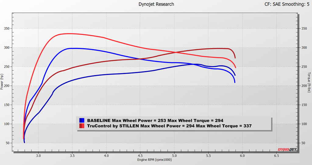 - Even greater gains come from the torque output. Maximum torque from the factory was measured at 294 torque. With the TruControl by Stillen Inline Power Module installed. Our test Stinger put down 337 ft. lbs of torque . This is an increase of nearly 50 ft. lbs of torque at the wheels.