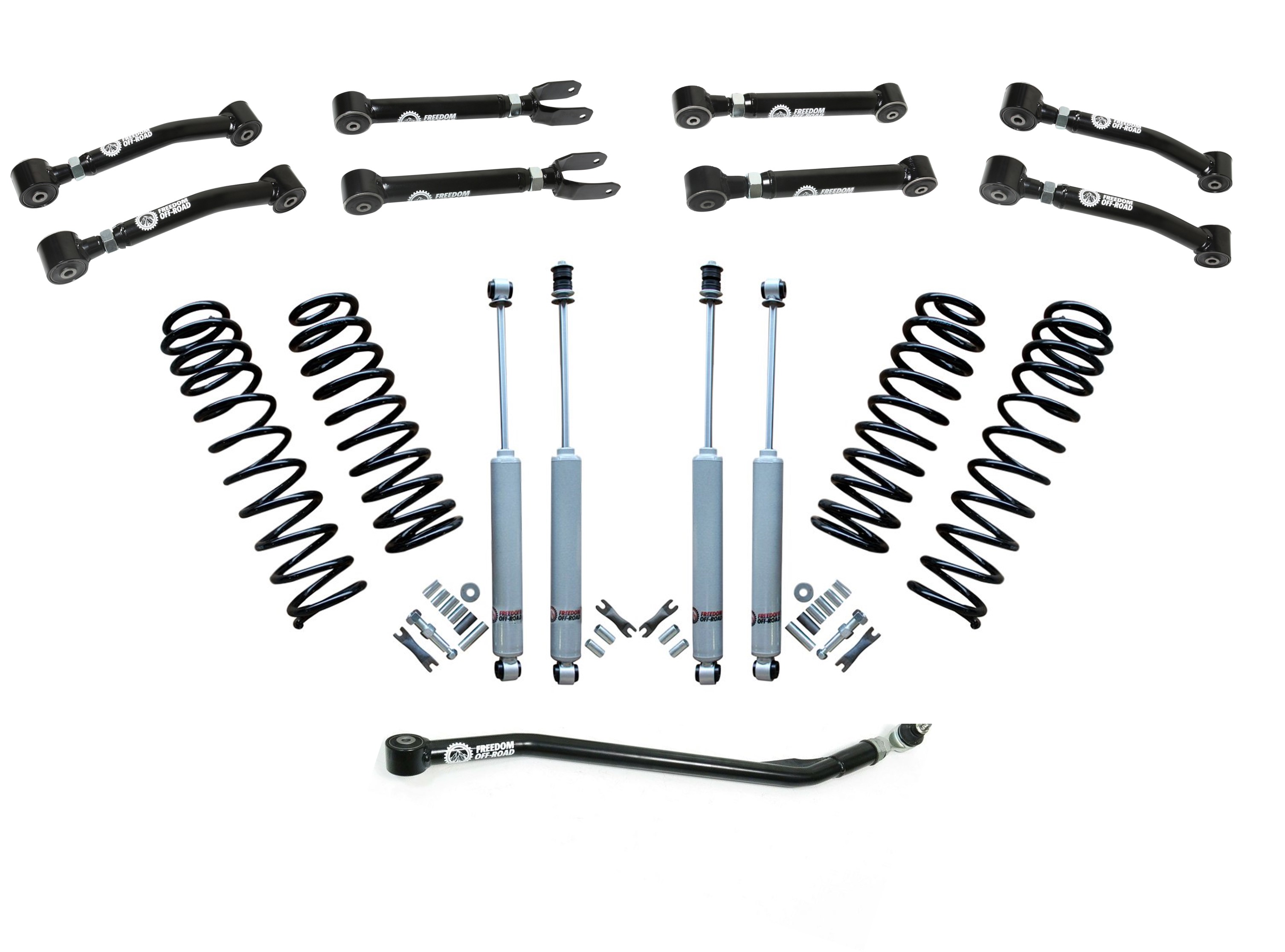 Freedom Off-Road's 2.5 Inch Lift Kit with Nitro Shocks is designed to elevate your off-road experience. This kit provides a substantial ground clearance and allows for larger tires, which is perfect for tackling rugged terrain. The included Nitro shocks offer superior performance with improved responsiveness and heat dissipation, ensuring a smoother and more controlled ride.