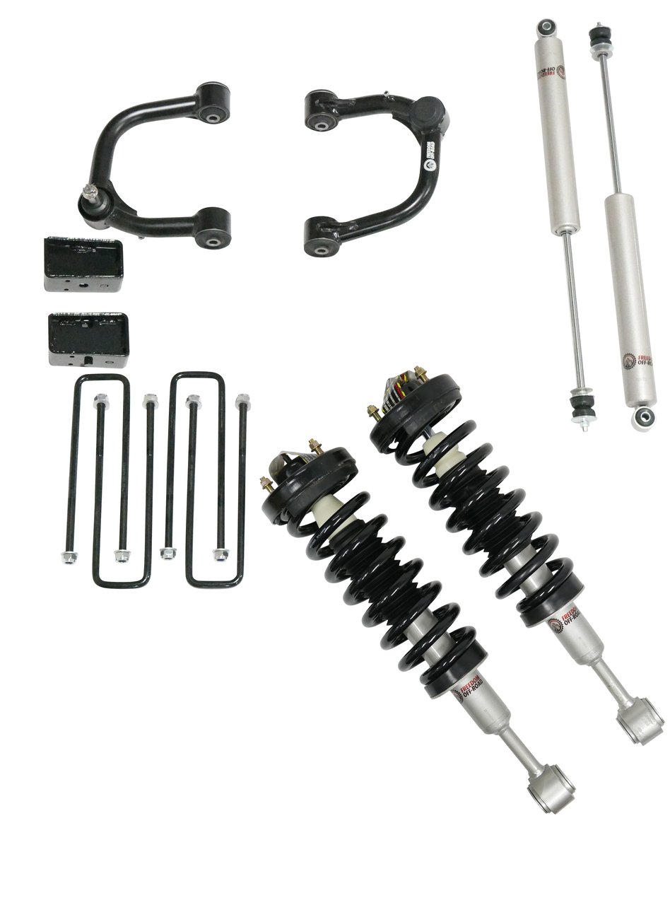 The front lift struts, fully assembled with new strut, spring, and top mount, are designed to improve your vehicle's performance. The carbon steel tapered rear lift blocks, including longer bolts, are a reliable upgrade for your worn or corroded existing hardware. The nitrogen-charged rear shocks, with application-specific valving and 40mm chromed hardened pistons, are designed to provide a smoother ride for lifted vehicles.