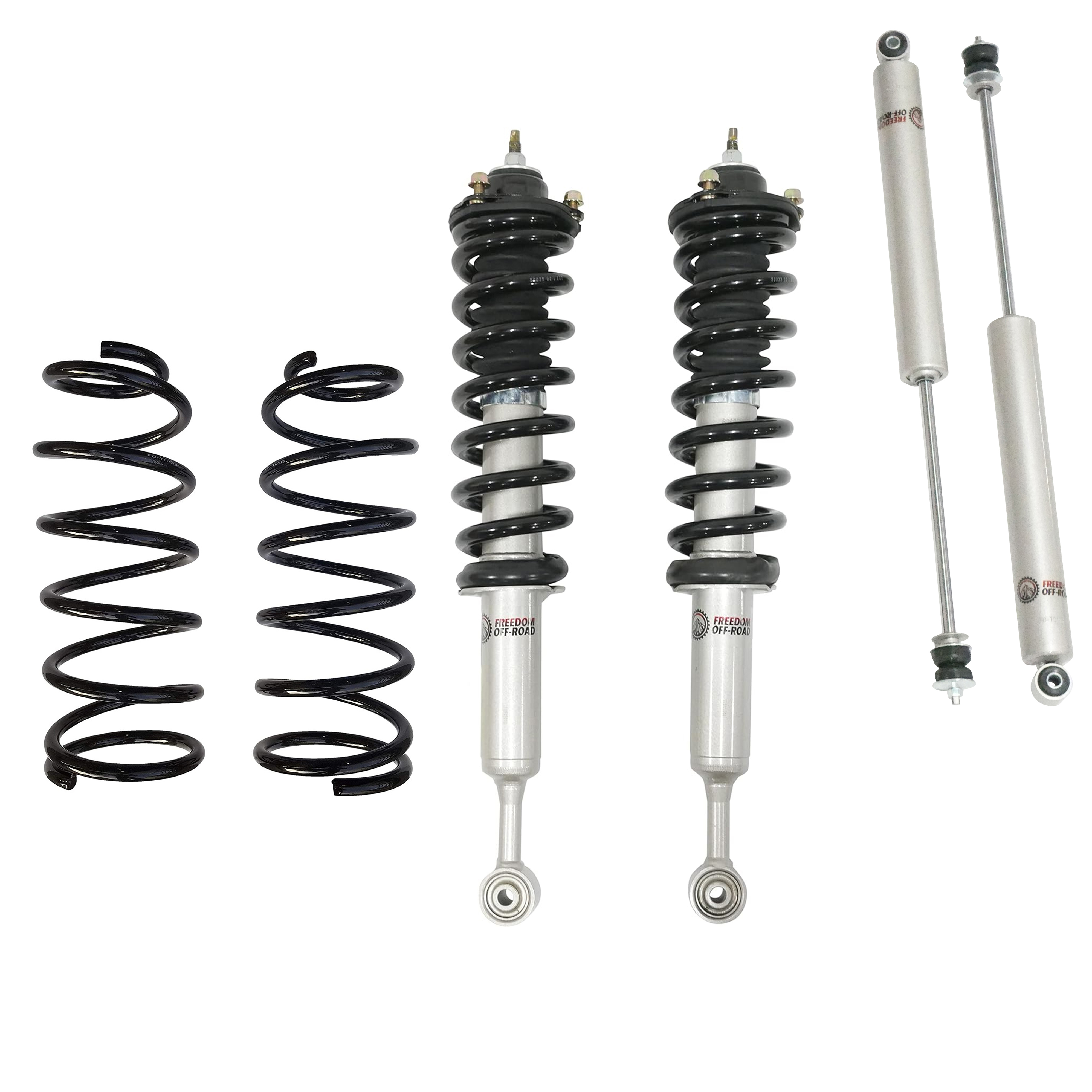 The front lift struts, fully assembled with a new strut, spring, and top mount, are designed to improve your vehicle's performance. Rear coil springs provide lift while maintaining ride quality. The nitrogen-charged rear shocks, with application-specific valving and 40mm chromed hardened pistons, are designed to provide a smoother ride for lifted vehicles.