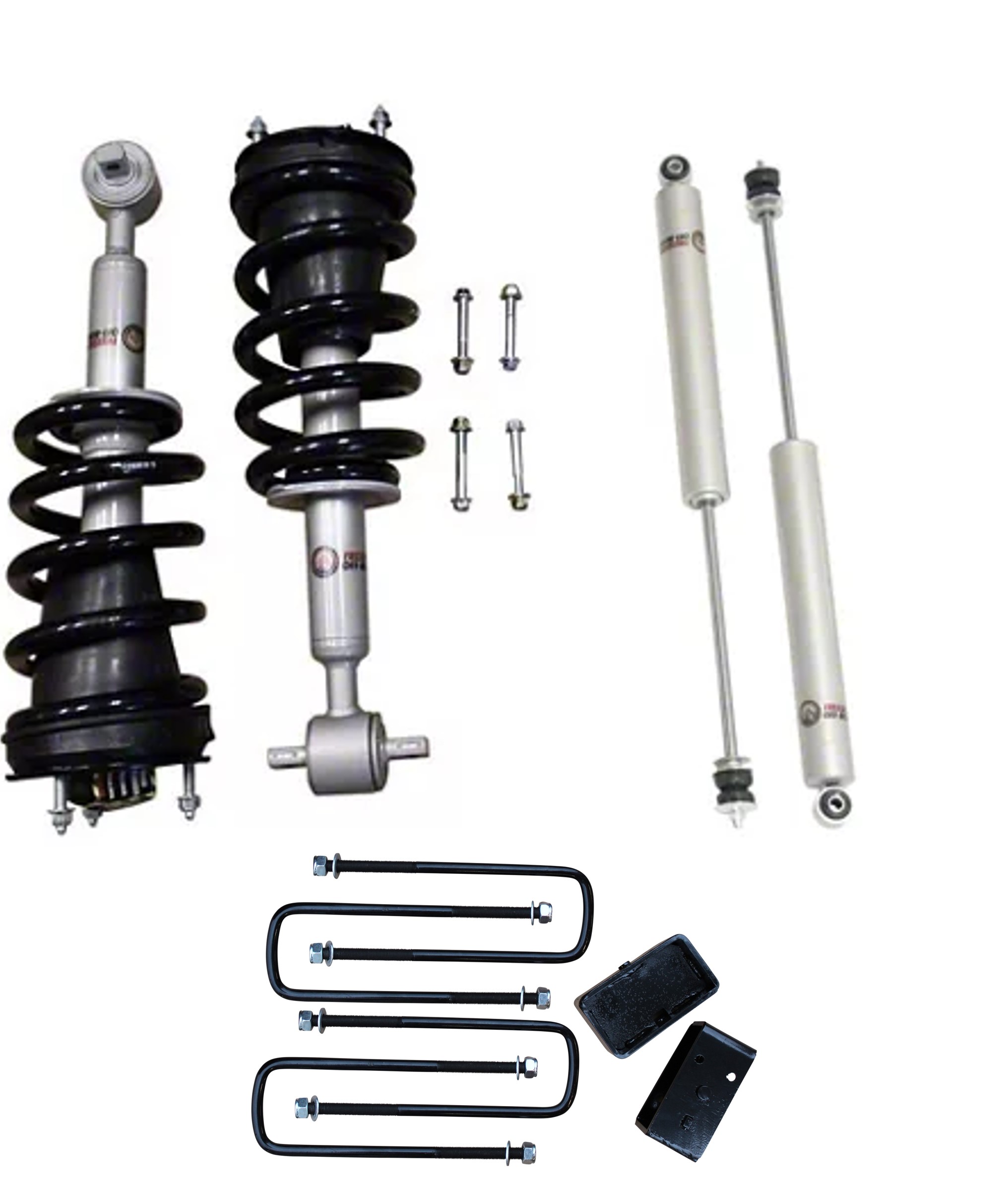 The front lift struts, fully assembled with a new strut, spring, and top mount, are designed to improve your vehicle's performance. The carbon steel tapered rear lift blocks, including longer bolts, are a reliable upgrade for your worn or corroded existing hardware.