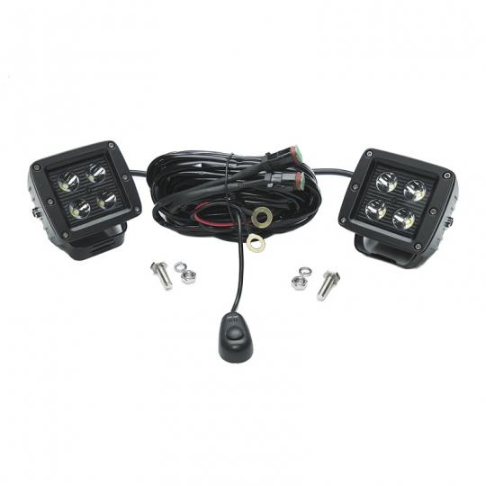 - Kit Components Two 3.0 inch LED cube lights, Dual lead wiring harness with switch/relay, mounting brackets and hardware