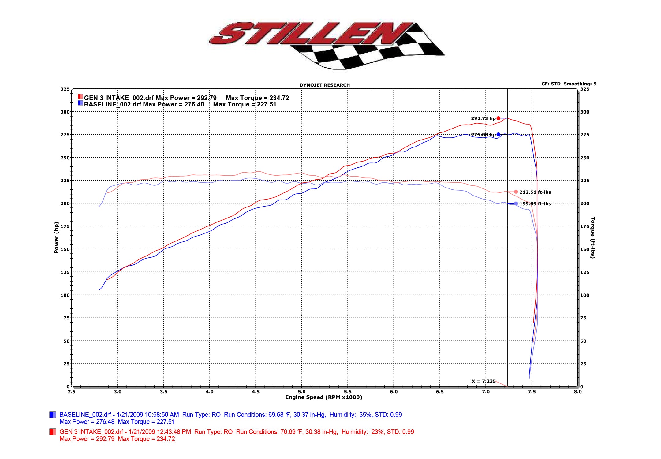 The end result: A dyno-proven 17.5 Horsepower (WHP) and 13 ft/lb (WTQ) gains on the 370Z - This translates to an estimated 20-22 horsepower gain at the flywheel. Again, let us emphasize here, this is on the STOCK ECU TUNE. No other cold air intake for the VQ can match these power gains - PERIOD.