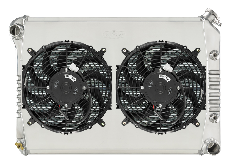 68-79 Nova Big Block Aluminum Performance Radiator And Dual 12 Inch Fan Kit. AT Transmission. Sits in saddle mounts without brackets. For bracket version, see CHC11ASK.