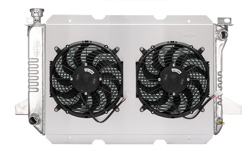 1985-1996 Ford F-Series Truck and Bronco Coyote Swap Aluminum Performance Radiator with Dual 12 Inch fan Module. COLD-CASE has taken the worry out of swapping the popular Coyote Engines in you F Series truck with this Coyotoe specific swap radiator.