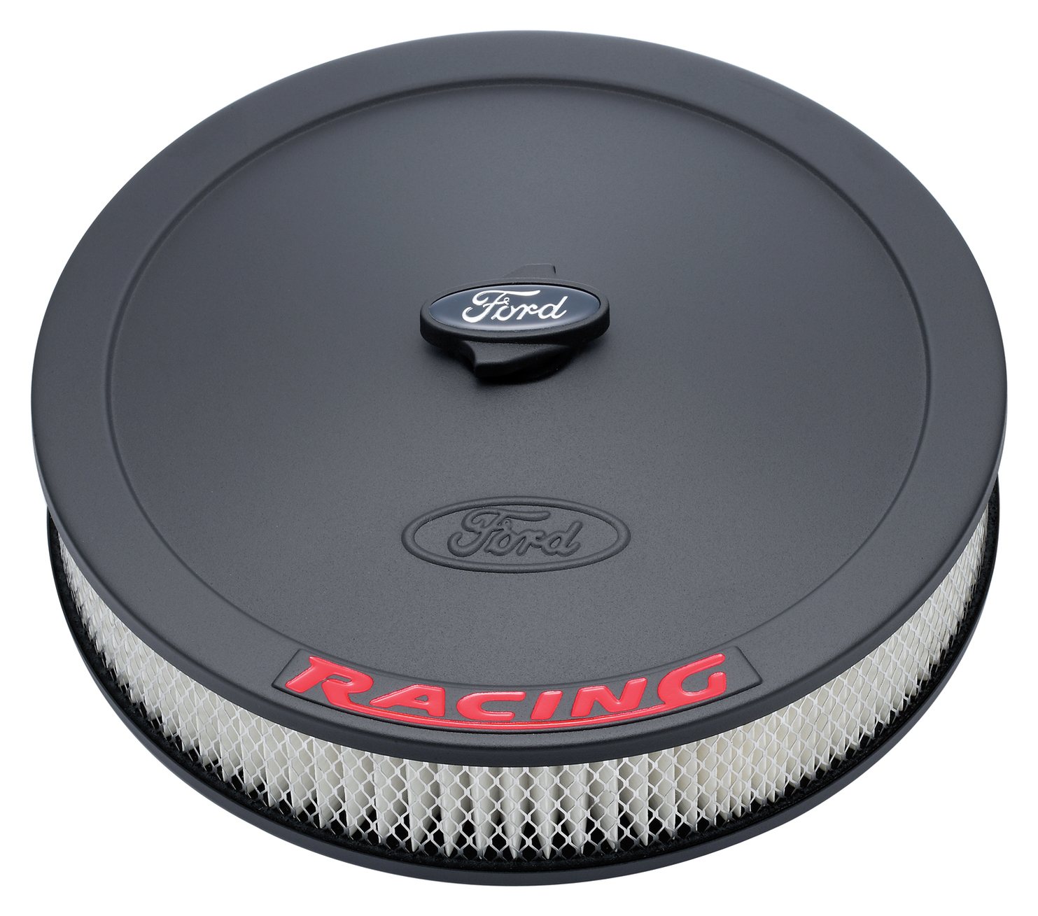 The air cleaner is one of the most visible parts on a cars engine, so now is the time to add a premium Ford Racing emblem to your ride for the perfect customized look. This engine air cleaner kit has a great looking black crinkle finish and is made from high quality steel. Features an embossed Ford logo on the top side. Overall size is 13 inches in diameter and includes a Ford Oval logo center nut. Fits all 4 barrel or 2 barrel carburetors with 5.125 inch mounting flange. Air cleaner base features a .625 inch drop. Kit includes a 2.625 inch tall Motorcraft paper filter element. This is an officially licensed Ford Racing product. Sold as one complete kit. Backed by a limited 30 day factory warranty.