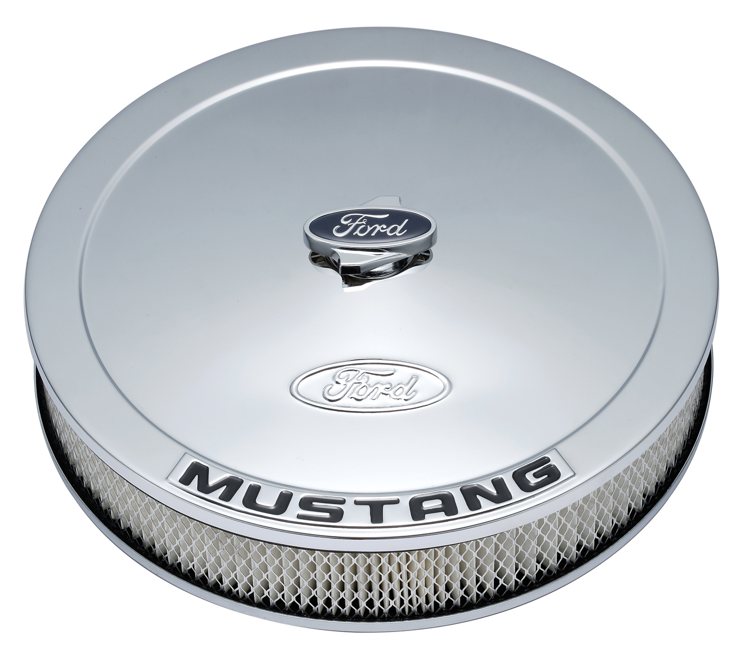 The air cleaner is one of the most visible parts on a cars engine, so now is the time to add a premium Ford Racing emblem to your ride for the perfect customized look. This engine air cleaner kit has a great looking chrome plated finish and is made from high quality steel. Features an embossed Ford logo on the top side. Overall size is 13 inches in diameter and includes a Ford Oval logo center nut. Fits all 4 barrel or 2 barrel carburetors with 5.125 inch mounting flange. Air cleaner base features a .625 inch drop. Kit includes a 2.625 inch tall Motorcraft paper filter element. This is an officially licensed Ford Racing product. Sold as one complete kit. Backed by a limited 30 day factory warranty.