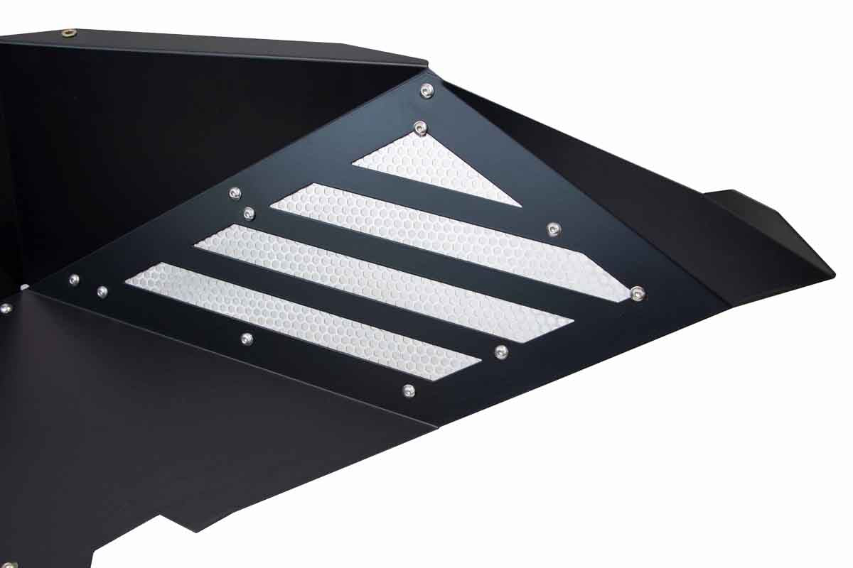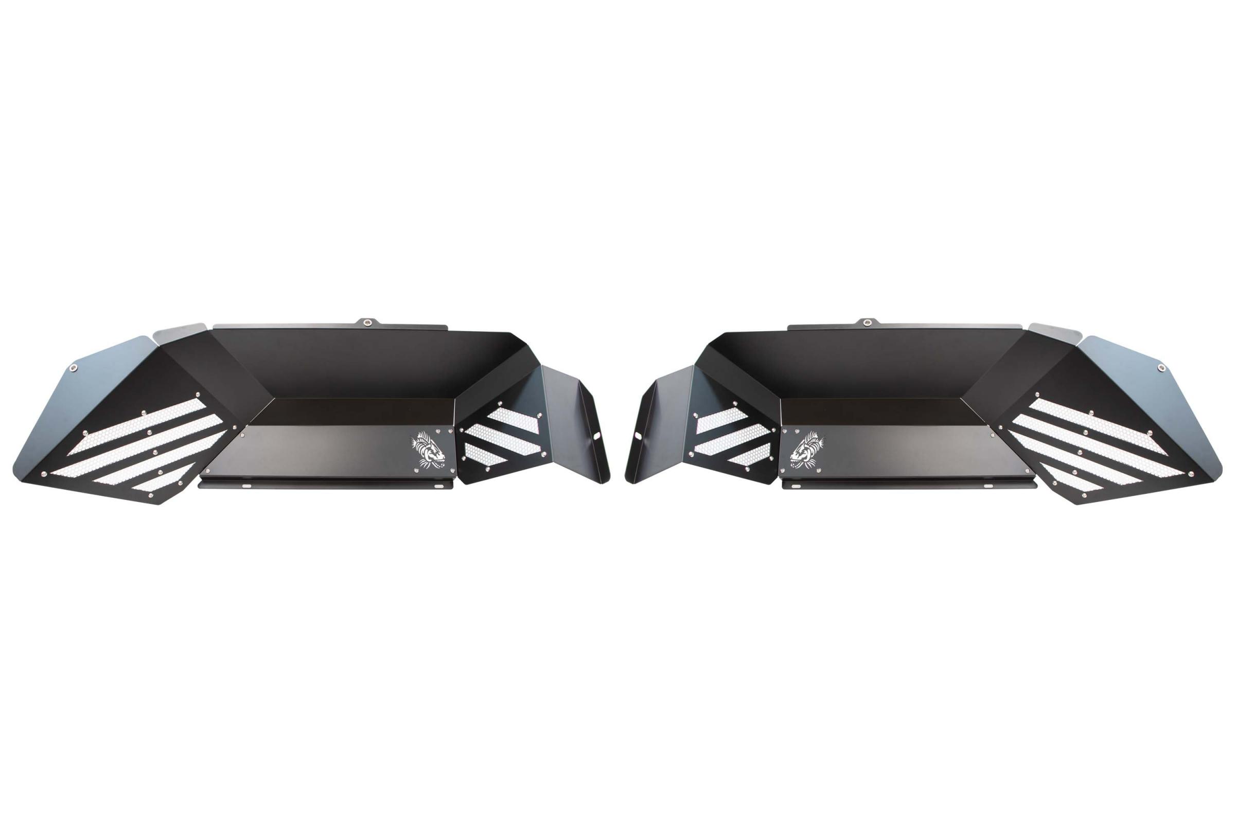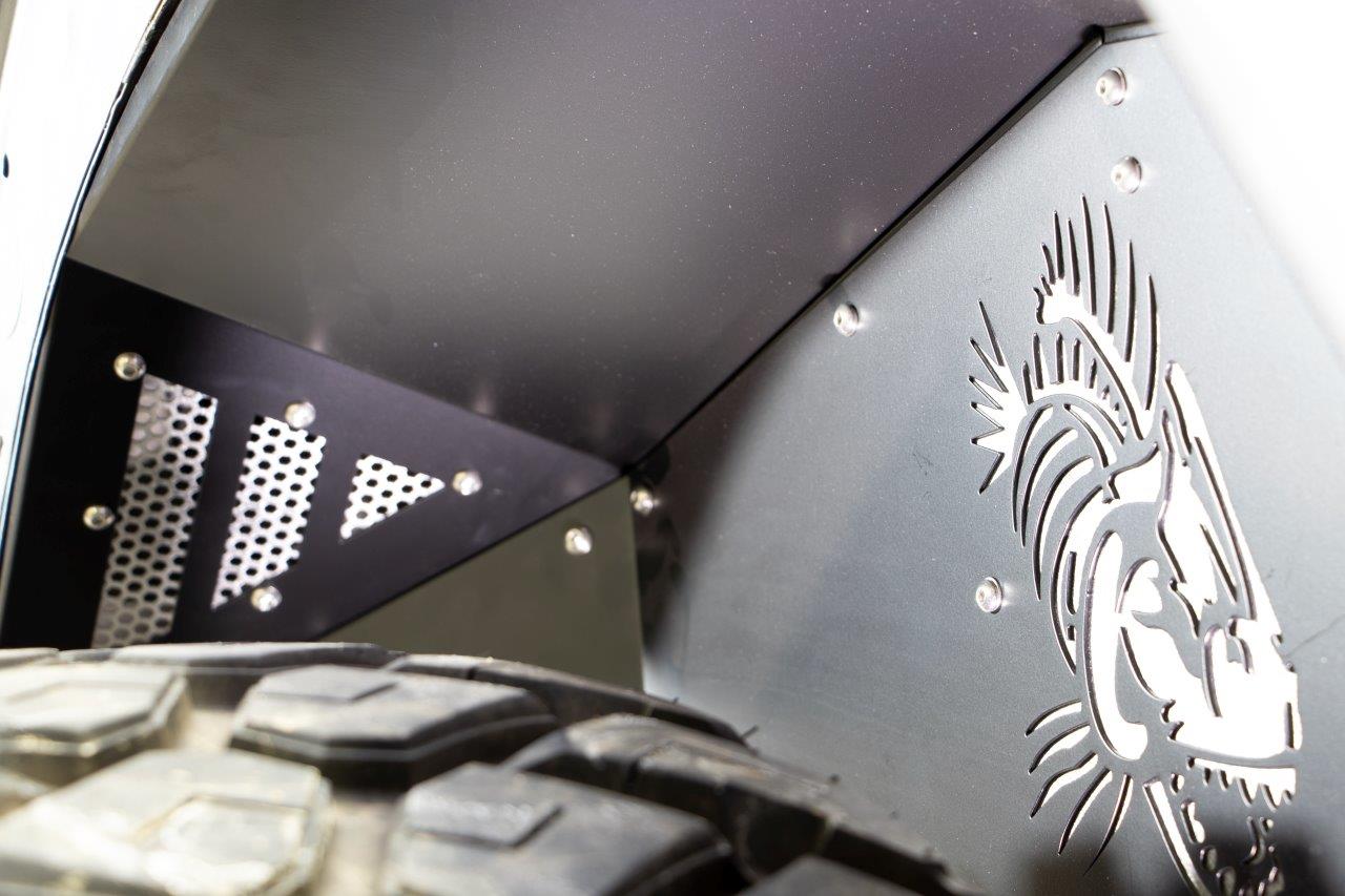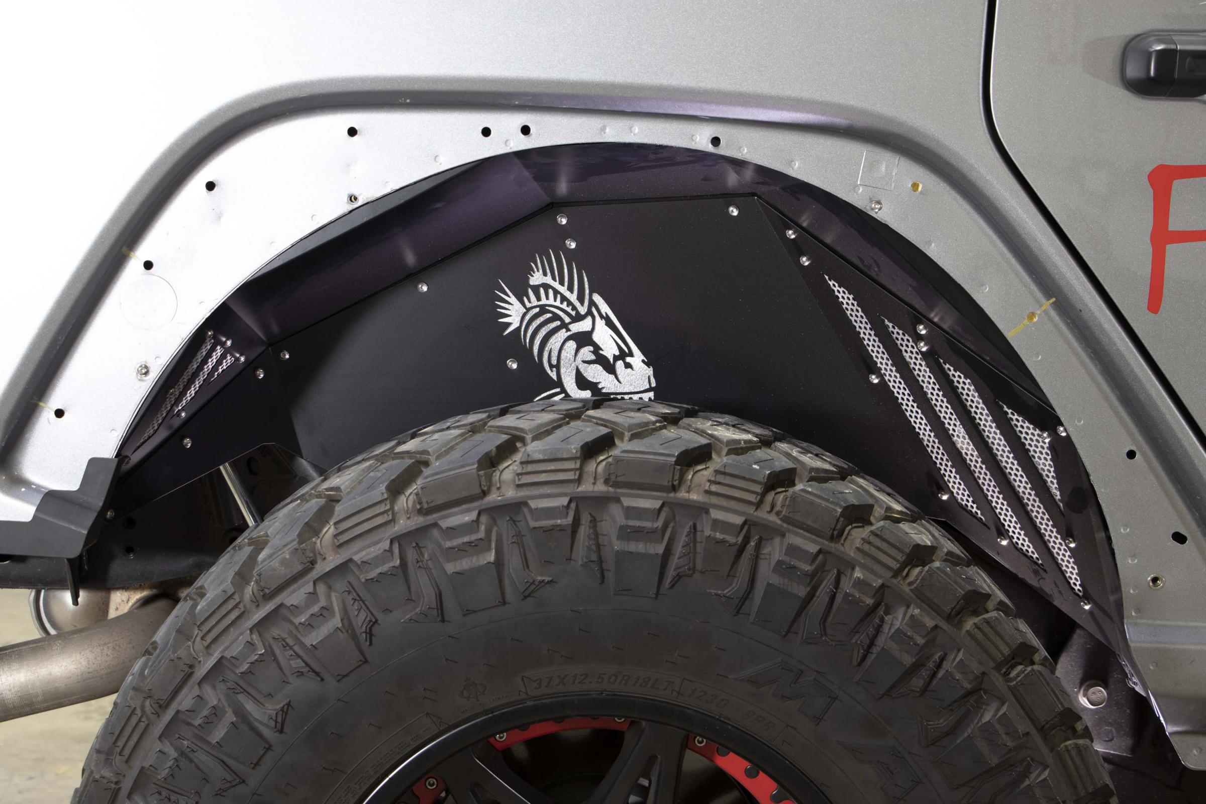 Each set includes both front and rear inner fenders, laser cut with the iconic Fishbone logo on all four panels, adding a distinctive and personalized touch to your vehicle's undercarriage. The innovative design features removable cooling vents and accent plates that can be custom-painted to match your Jeep's unique style.
