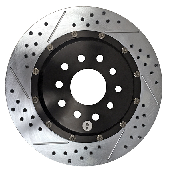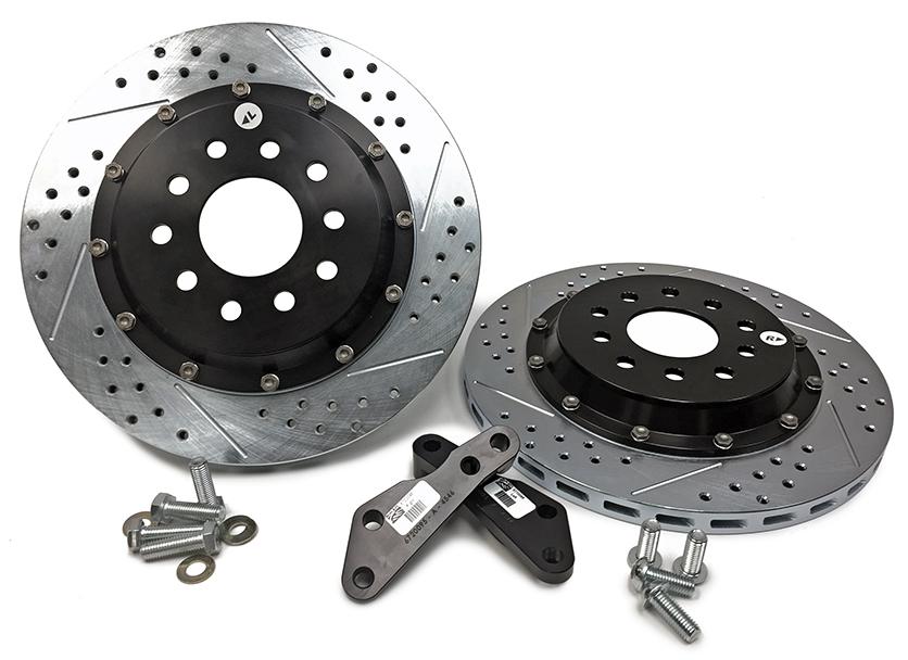 This system features brackets to relocated your factory caliper to allow the use of our 13 inch 2pc slot, drill, zinc plated directional rotors. The EradiSpeed+1 is a simple bolt on (no bleeding of the brakes required). By increasing rotors diameter, you increase torque and leverage of the brake. A very popular upgrade for customers increasing wheel diameter that want to improve braking, as well as a visual impact behind the open wheel. Furthermore, the directionally vaned structure helps to advance cooling efforts, and the 2pc design of aluminum hat bolted to rotor ring greatly reduces overall weight!