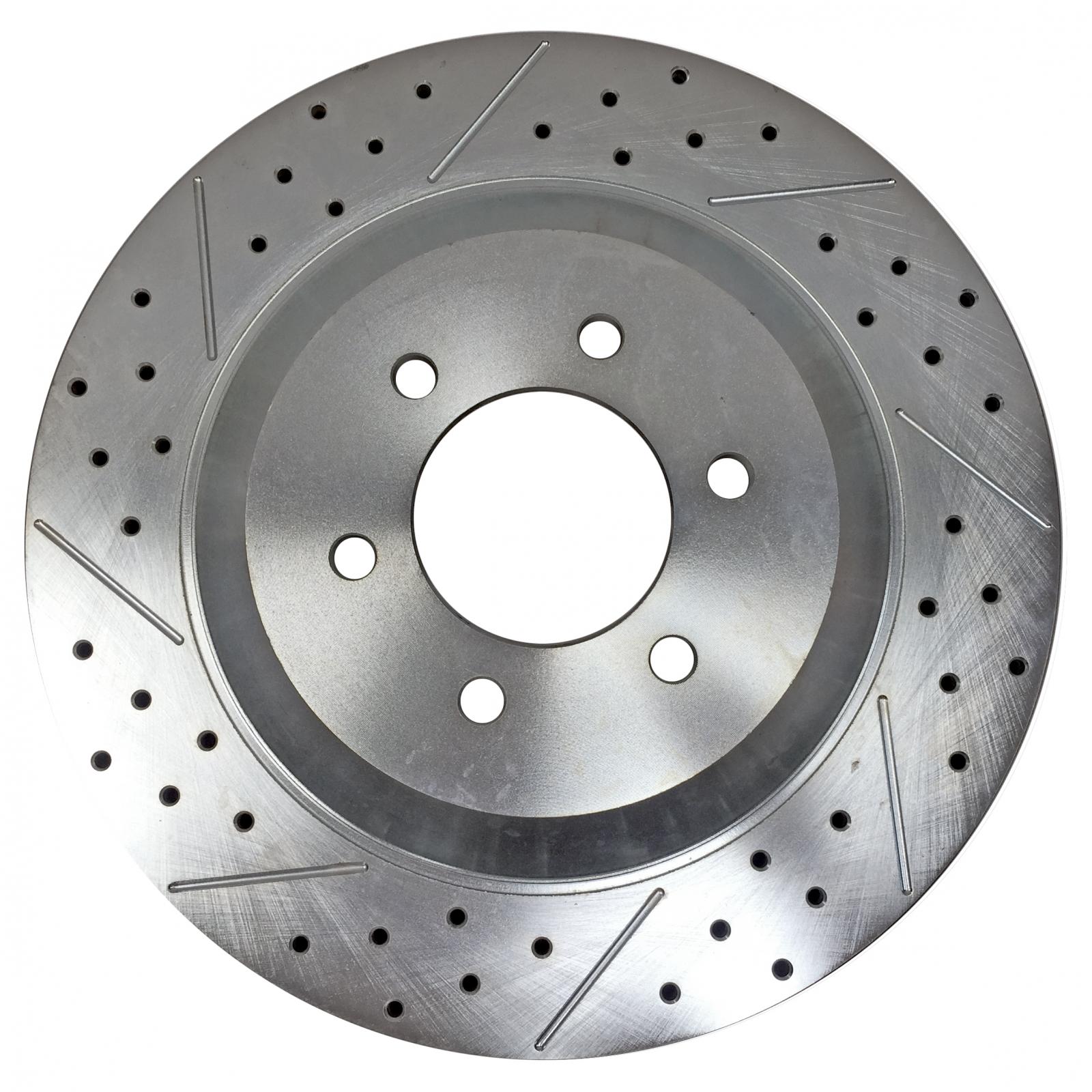 This system features brackets to relocated your factory caliper to allow the use of our 15 inch 1pc slot, drill, zinc plated directional rotors. The EradiSpeed1 is a simple bolt on (no bleeding of the brakes required). By increasing rotors diameter, you increase torque and leverage of the brake. A very popular upgrade for customers increasing wheel diameter that want to improve braking, as well as a visual impact behind the open wheel Further, the directionally vaned structure of the rotor improves cooling efforts.