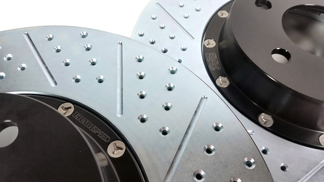 The EradiSpeed+ is a direct replacement 2pc rotor for the 2013-2014 Mustang GT500. This is designed to work with the factory Brembo brake system. These 15 inch rotors feature directional vanes advancing cooling efforts, and are a 2pc design with an anodized black 6061-T6 aluminum center hat bolted to the rotor ring, which greatly reduces weight.