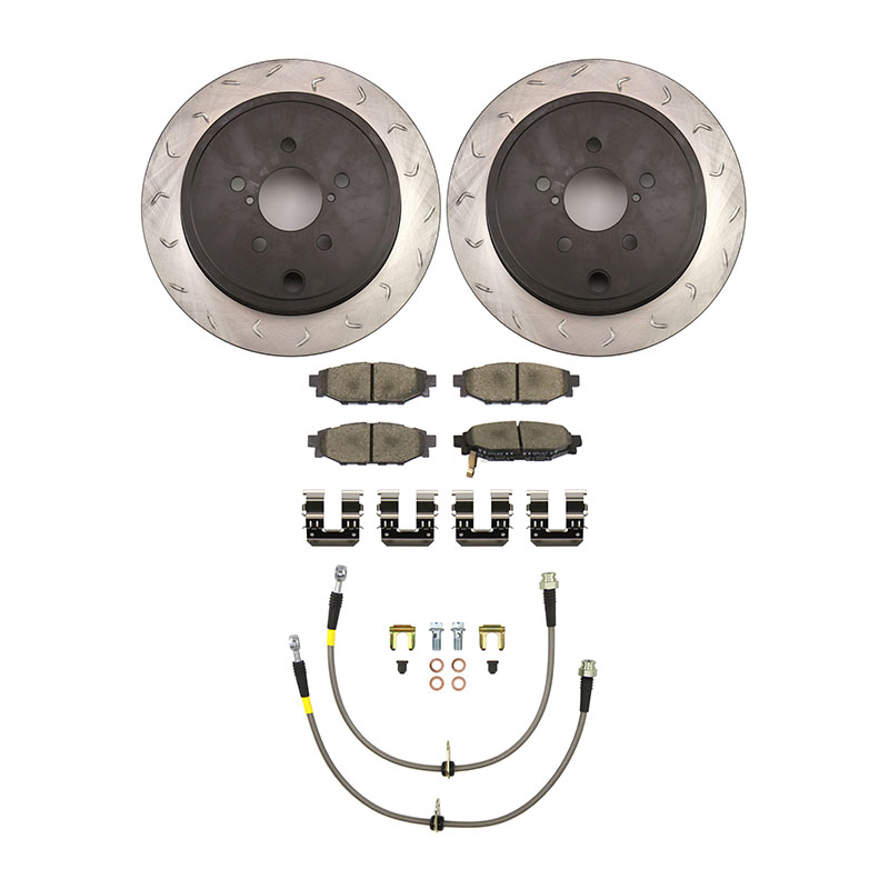 This kit includes new rotors, brake pads, and stainless steel brake lines to improve the braking performance of your vehicle. Rear location Fitment