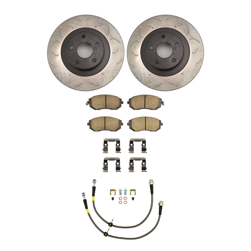 This kit includes new rotors, brake pads, and stainless steel brake lines to improve the braking performance of your vehicle. Front Location Fitment Note: For all 02/03 WRX owners, please verify pad Fitment before purchase.