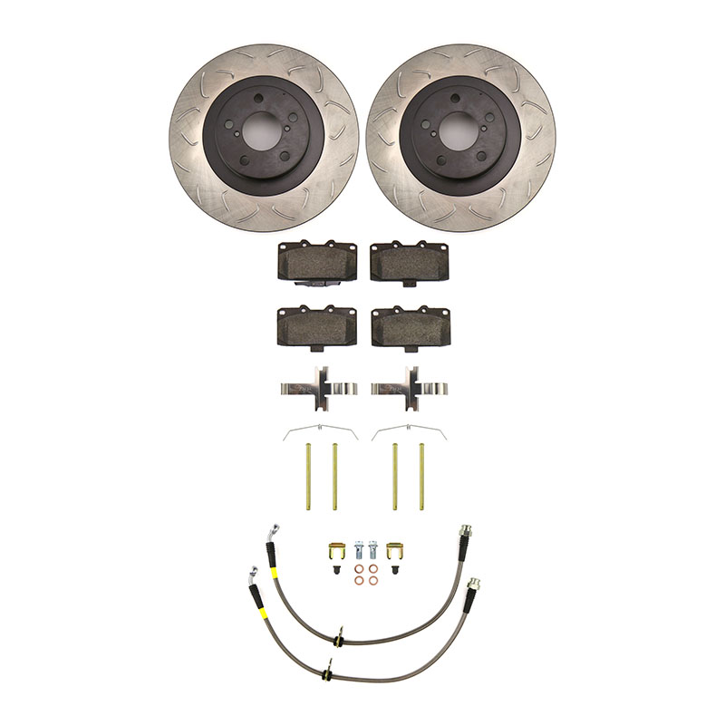 This kit includes new rotors, brake pads, and stainless steel brake lines to improve the braking performance of your vehicle. Front Location Factionfab Swept Slot Bi Directional Rotor Pair Front