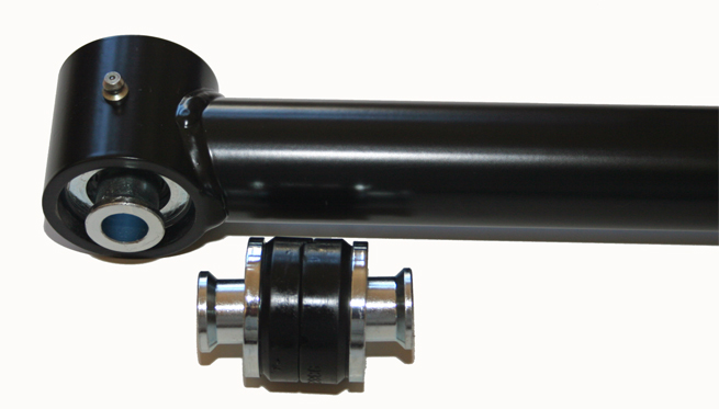 It has become common practice to replace the stock rubber control arm bushings with solid or two piece polyurethane bushings to resolve the shortcomings of the soft rubber bushings. Hard polyurethane bushings eliminate wheel hop, reduce axle deflection, and improve rear straight line grip. However, the downside of common aftermarket bushings such as delrin, steel, stiffer rubber, solid or two piece polyurethane bushings is they prevent the necessary movement of the control arms during body roll, which in turn produces significant binding in the suspension when the vehicle is cornering. The polyurethane bushings also place unnecessary high stresses on the torque boxes, which are the attachment points for the control arms to the chassis. Standard aftermarket control arms do not allow for rotation of the control arm during cornering because of the stiffness of the bushings.