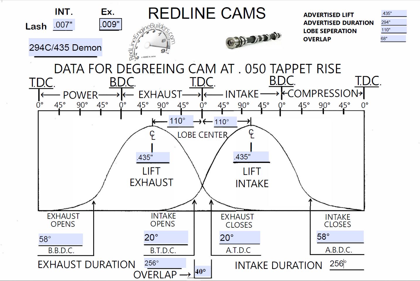 - This camshaft may Not work with EFI applications. lift is .435 inch duration 294 overlap 68 and lobe separation is 110.