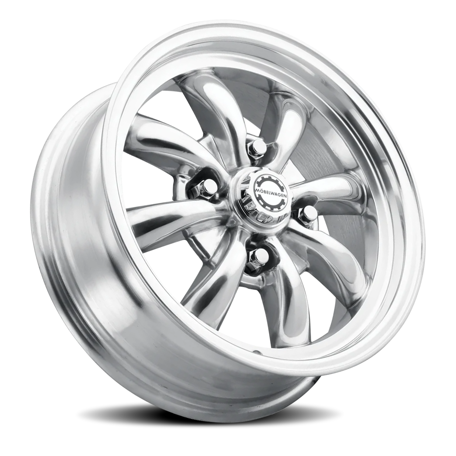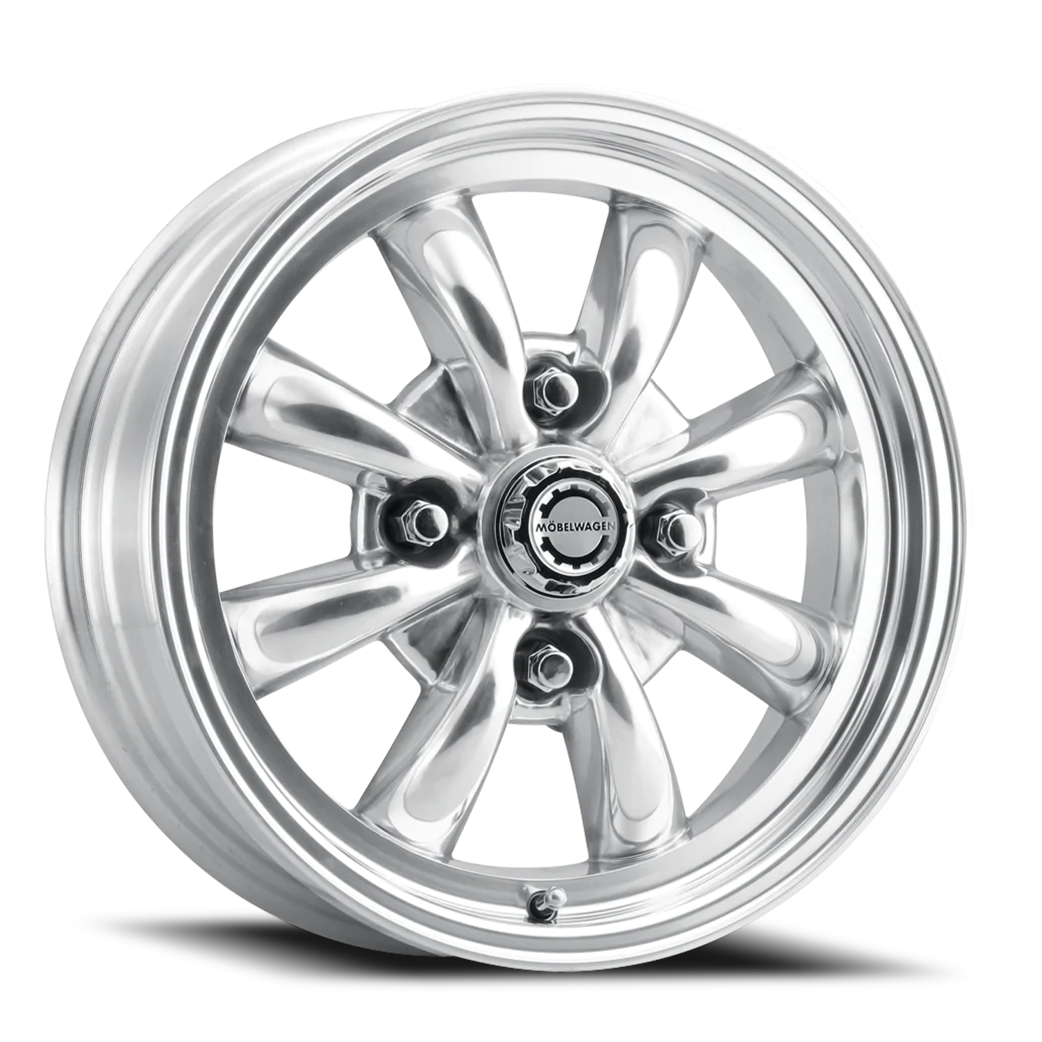 - Available in gloss silver or satin black with machined center and full polished finishes with laser engraved Mobelwagen logo