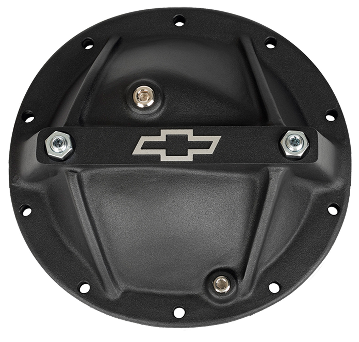 Reinforced lightweight aluminum rear end cover designed to strengthen the rear housing case in heavy torque situations. The familiar Bowtie Emblem is raised and precision milled on a black crinkle coated surface. Each cover includes two bolts to stabilize bearing main caps, a fluid capacity plug, a magnetic drain plug, and Grade 8 mounting bolts. Exterior of the cover has a black crinkle finish. Sold individually.