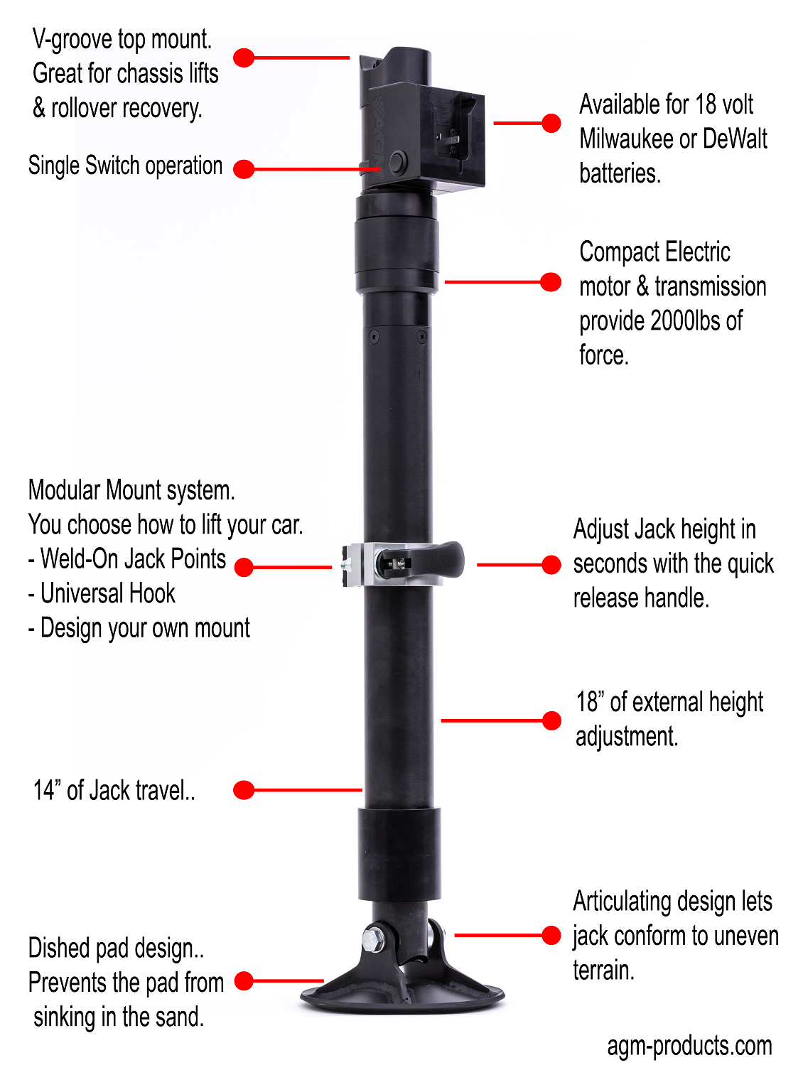 Why struggle with unsafe mechanical jacks, weak air jacks or limited use screw jacks? Now you can safely lift your ride with zero effort. The Electric Jack makes easy work of any lift with its single button operation and on the fly, quick release height adjustment.
