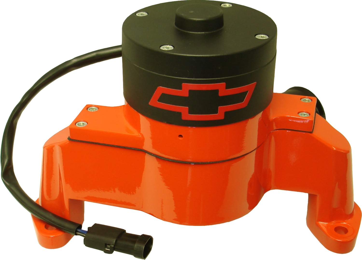 Eliminates unnecessary weight and impeller-drag experienced at high RPM, pumps up to 35+ gallons of water per minute, and delivers the cooling that can make the difference between a win and second place! Durable but light-weight die-cast aluminum, epoxy powder coated for corrosion resistance in the color of your choice. Each unit comes with the popular Chevy Bowtie Emblem in red. Race or street. Comes with FREE inlet fitting, 1 inch pipe to 1-3/4 inch hose, mating weathertight connector. Officially Licensed Chevrolet Performance Product. Sold Individually.