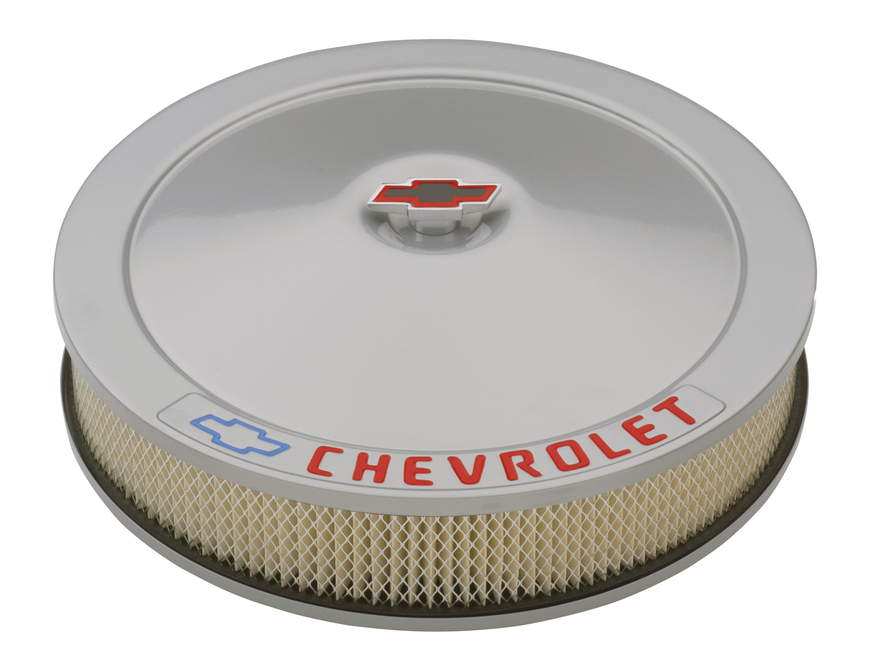 These air cleaner kits are offered in two styles, the classic, which reflects many years of GM air cleaner styling, and the newer high-performance look. They are equipped with the CHEVROLET Emblem, and they are supplied with genuine GM (AC) air filter elements for maximum airflow. Both the tops and the bases have matching finishes, except carbon-style, and each kit is supplied with necessary mounting hardware. The classic air cleaner kits are supplied with special die-cast Bowtie center nuts, except P/N 141-906, also offered separately. The 14 inch air cleaner kits are supplied with 3 inch tall filter GM P/N 6421746 or AC P/N A212CW. For buyers wishing a taller 4.031 inch filter, purchase GM P/N 8997189 or AC P/N A697C. The bases of the 14 inch air cleaner kits are recessed for a low profile appearance, maximum performance and hood clearance. Technical Note: After installing a new air cleaner kit, always lower the hood slowly to confirm sufficient clearance visually. Minimum clearance of 3.75 inches is required from the top of the carburetor gasket area to the underside of the hood.