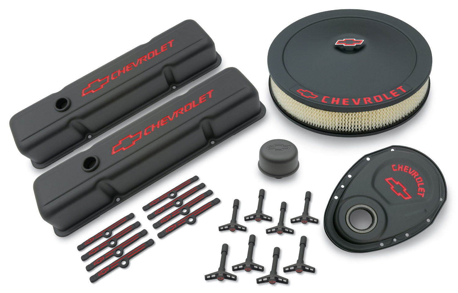 High-Tech Series Dress-Up Kit for Chevrolet Small-Block V8, 1958-1986. Includes tall baffled Bowtie valve covers, Chevrolet 14 Inch Classic Air Cleaner with element and Bowtie center nut, plus Bowtie timing chain cover with GM production oil seal installed, Bowtie push-in air breather, Bowtie Valve Cover Wing Nuts, Bowtie Valve Cover Hold Down Clamps, and grommets (air breather cap and PCV). All of these items in Black Crinkle Finish With Red Chevrolet and Bowtie Logos. This is Officially Licensed Chevrolet Performance Parts Product. Sold as one kit.