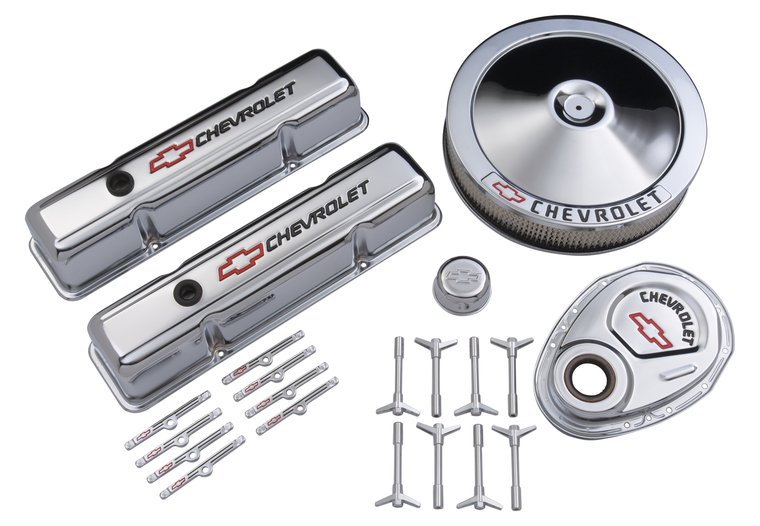 High-Tech Series Dress-Up Kit for Chevrolet Small-Block V8, 1958-1986. Includes tall baffled Bowtie valve covers, Chevrolet 14 Inch Classic Air Cleaner with element and Bowtie center nut, plus Bowtie timing chain cover with GM production oil seal installed, Bowtie push-in air breather, Bowtie Valve Cover Wing Nuts, Bowtie Valve Cover Hold Down Clamps, and grommets (air breather cap and PCV). All of these items in Chrome Plated Finish With Black Chevrolet and Red Bowtie Logos. This is Officially Licensed Chevrolet Performance Parts Product. Sold as one kit.