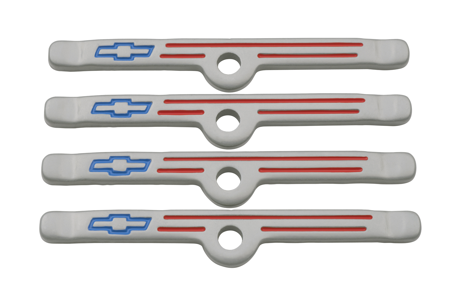 Engine Valve Cover Holdown Clamps Gray with Blue Bowtie Logo SB Chevy 4 Pcs Red Lines & Blue Bowties Chevrolet Performance Parts