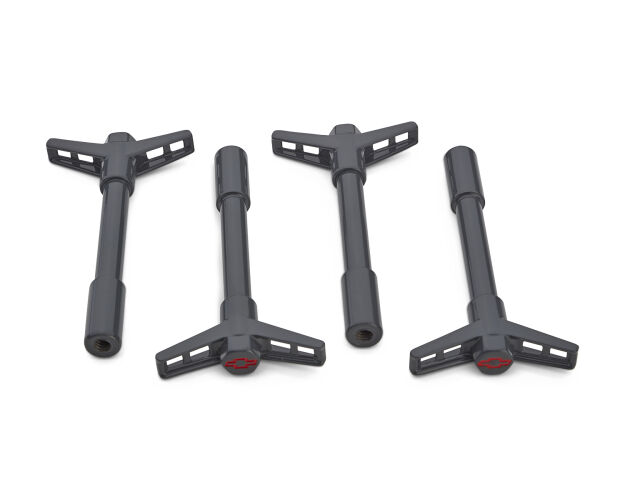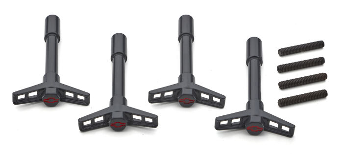 Chevrolet Performance's latest finish, Shark Gray, is now available for valve cover wing nuts. Chevrolet Bowtie Emblem is cut sharply into the top of each wing nut then inlaid with classic Chevrolet red. The lower ends of the shafts are manufactured with wide shoulders for broad load distribution, and each wing nut is supplied with a separate stud which permits precise gasket positioning on the head prior to mounting the valve covers.