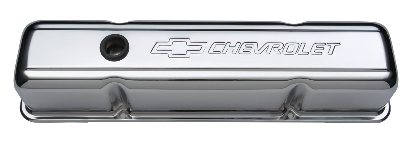 These engine valve covers are manufactured from high quality stamped steel material. They are a tall style valve cover and feature oil breather baffles. The valve covers have a great looking and long lasting chrome plated finish that also includes the Chevrolet and Bowtie logos. Designed to fit 1955 to 1986 262-400 Small Block Chevy engines. This is an officially licensed GM Performance Parts product. Sold as one pair. Backed by a limited 30 day factory warranty.