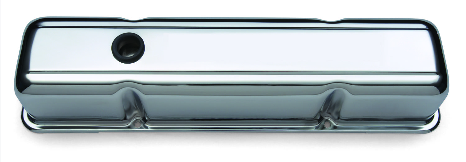 These engine valve covers are manufactured from high quality stamped steel material. They are tall style valve cover and feature oil breather baffles. The valve covers have a great looking chrome plated finish. Designed to fit 1955 to 1986 262-400 Small Block Chevy engines. This is an officially licensed Chevrolet Performance Parts product. Sold as one pair.