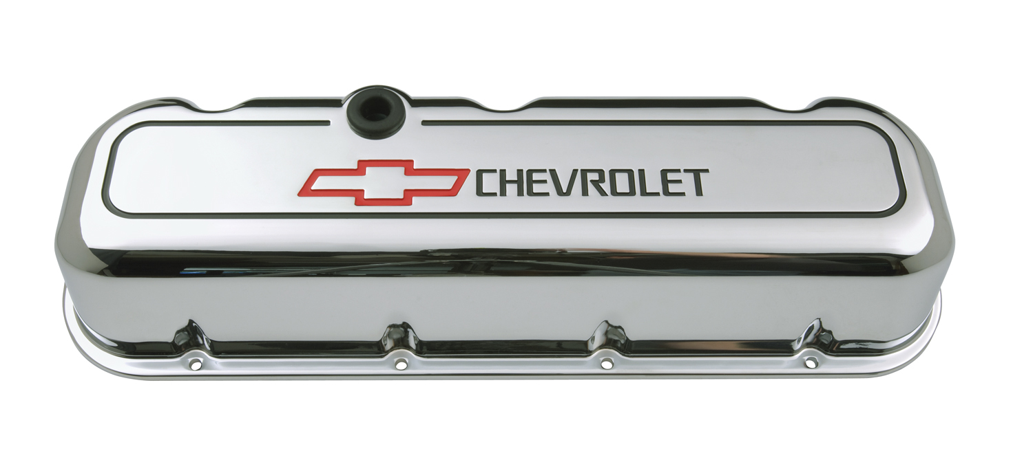 These premium valve covers are die-cast aluminum, manufactured to GM specifications, and includes GM-designed baffles. They have recessed Bowtie and Chevrolet Emblems, inlaid with classic Chevrolet red and black. Includes baffles and grommets. Fits 1965 to 1996 396-454 Big Block Chevy engines. Sold as one pair. Officially Licensed Chevrolet Performance Parts Product.