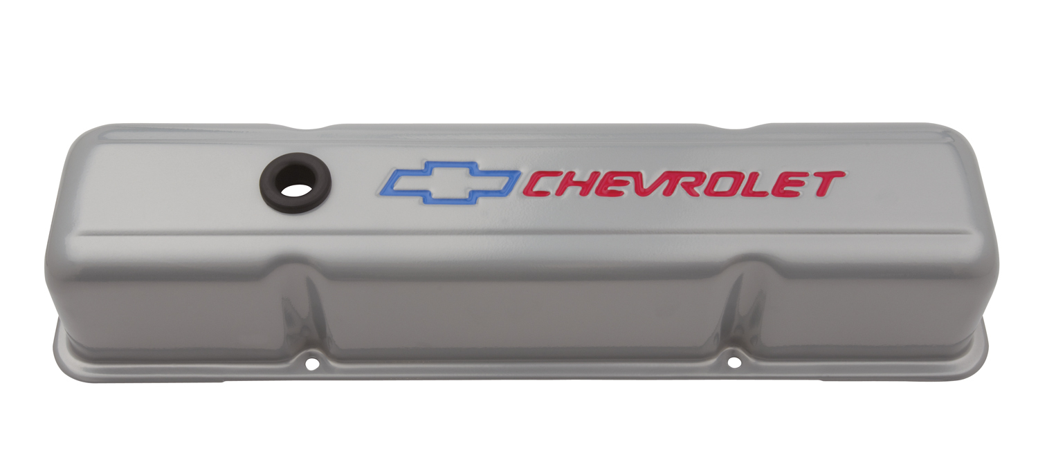 These tall stamped steel valve covers are electrostatically painted and baked with a durable high-tech, Metallic Gray Powdercoat, and finished with the famous Chevrolet and Bowtie emblems and feature oil breather baffles. They also include Red Chevrolet and Blue Bowtie logos. Designed to fit 1955 to 1986 262-400 Small Block Chevy engines. This is an officially licensed GM Performance Parts product. Sold as one pair. Backed by a limited 30 day factory warranty.