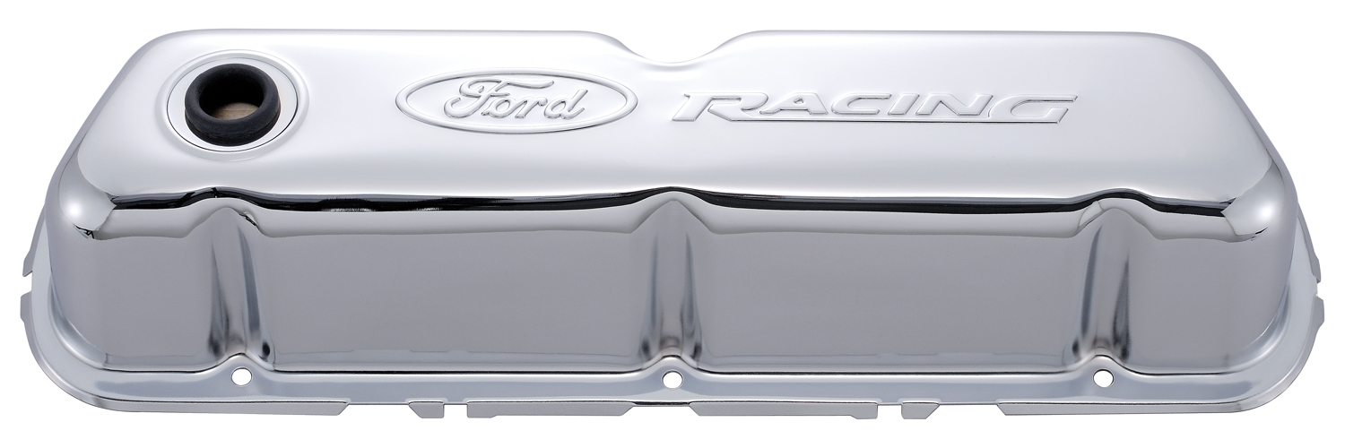 These premium stamped steel valve covers are offered in a deep chrome plated look, Black Crinkle, and the new Carbon Style look. In addition to the classic raised Ford Racing emblem, you may choose from a new selection of recessed styles featuring the striking COBRA, Mustang, and Racing emblems. All valve covers include baffles and grommets. Sold in pairs. Note: Not for use on engines with EFI manifolds.