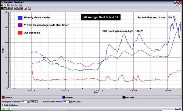 During testing on a loop consisting of mixed driving on the freeway at high rpm and high speeds to generate as much heat as possible and in stop and go traffic on surface streets, the M7 Exhaust Heat Shield reduced under hood temperatures an average of 68 degrees F.