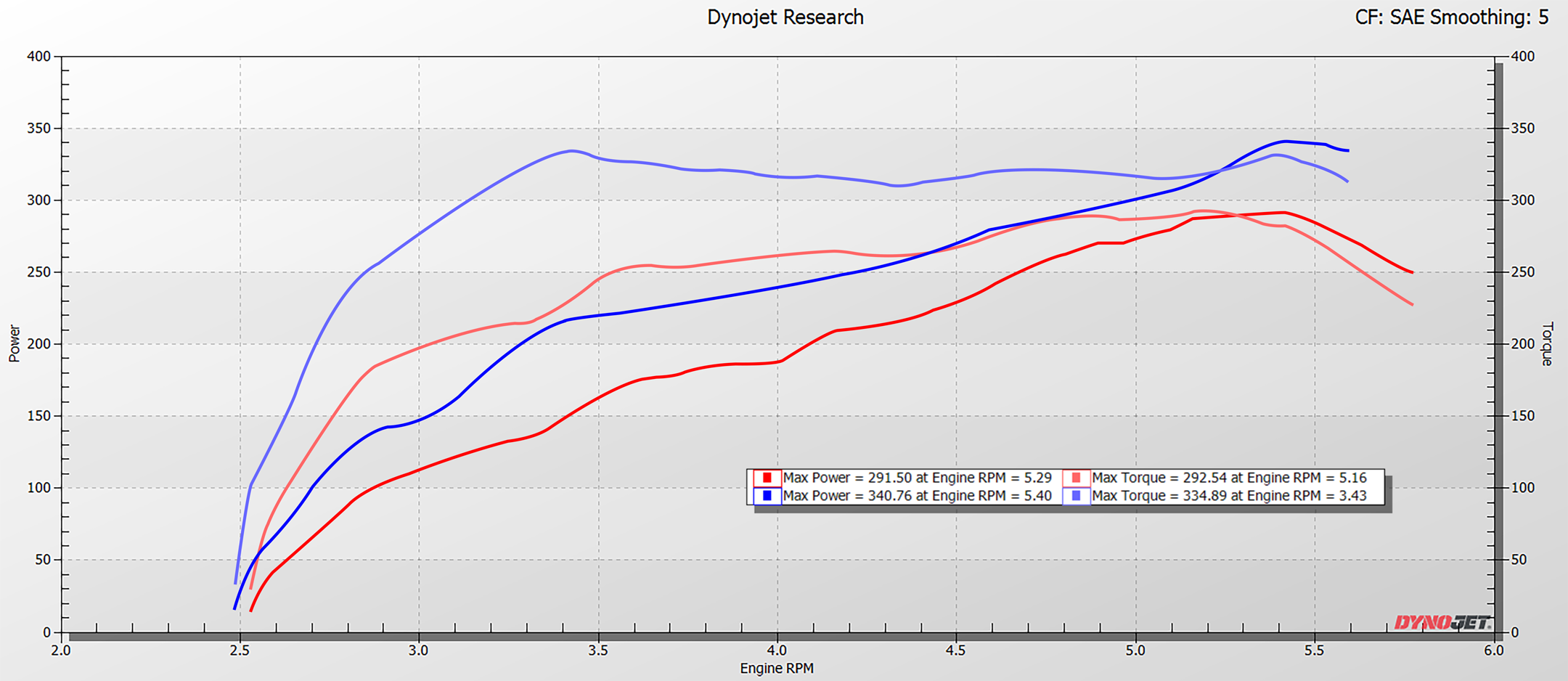 We strapped a totally stock truck up to our Dynojet dynamometer with the only modification being our TruControl. The F150 produced a baseline horsepower of 291 and 292 torque with 89 octane. With the TruControl by STILLEN Inline Power Module, the F150 produced 341 HP and a staggering 334 TQ at the wheels. This is a massive 50 HP and 73 TQ gain at the rear-wheels gain by simply plugging in the TruControl by STILLEN Inline Power Module.