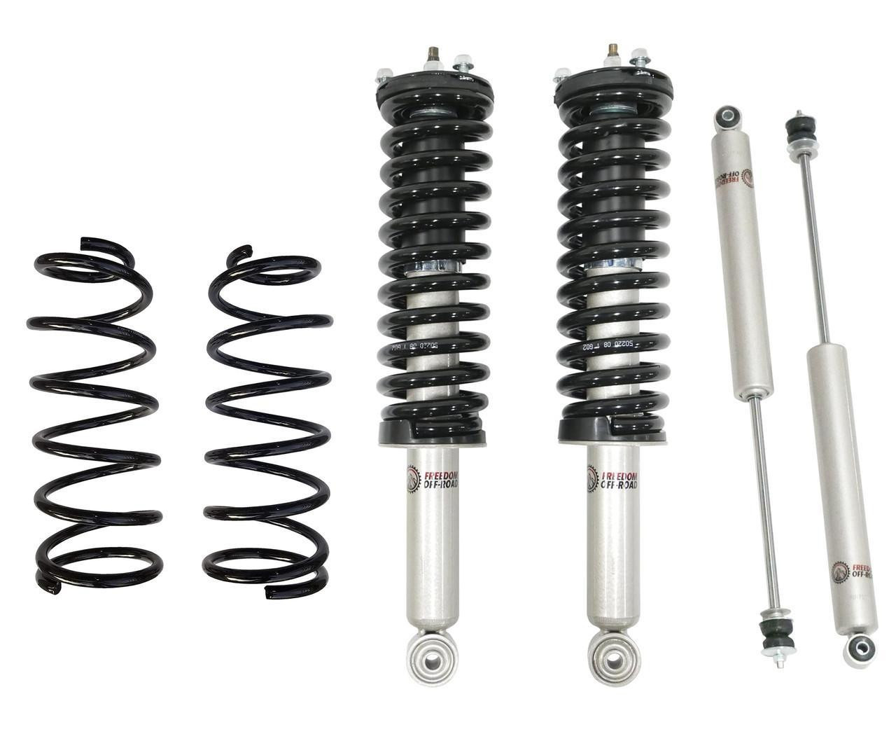 The front lift struts, fully assembled with a new strut, spring, and top mount, are designed to improve your vehicle's performance. Rear coil springs provide lift while maintaining ride quality. The nitrogen-charged rear shocks, with application-specific valving and 40mm chromed hardened pistons, are designed to provide a smoother ride for lifted vehicles.