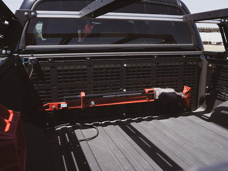 Mount anything from MOLLE bags, trail gear, tools, high lift jacks, axes, shovels, and much more. Wherever you may go, be prepared, with a bed MOLLE system from Cali Raised LED. Designed for the Front End of your truck bed.